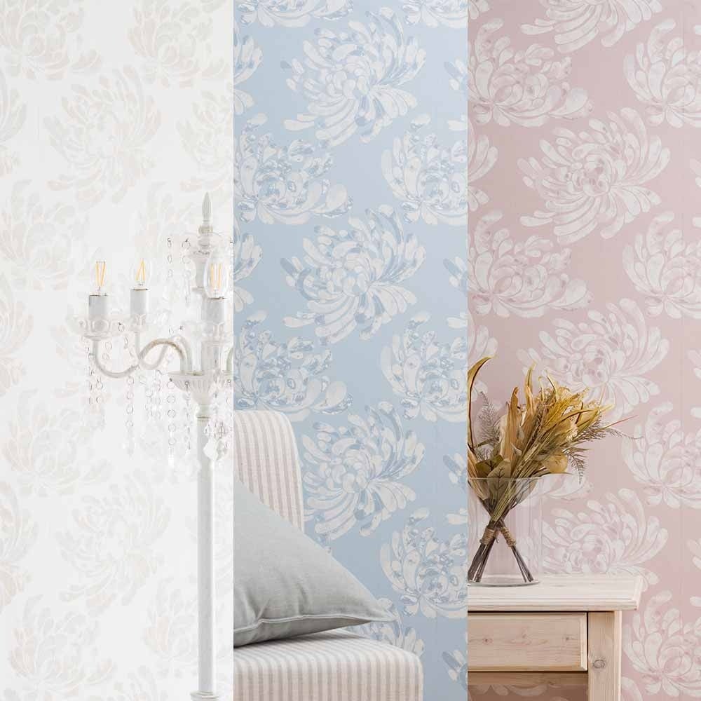 テクスチャのないフラットなベースに大輪のクリサンセマム(菊)の花が規則的に並んだデザイン。同じカラーのトーンのみで水彩画のように描かれた花びらがシンプルながら上品でかわいらしく、インテリアにも合わせやすい。ホワイト、ブルー、ピンクの3色展開。
