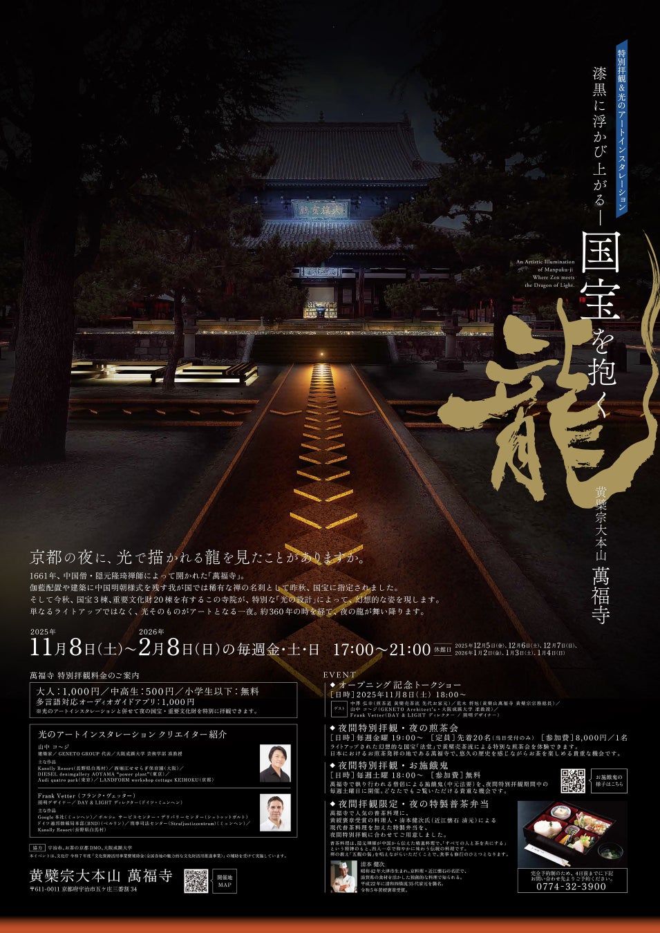 1661年、中国僧・隠元隆琦禅師によって開かれた「萬福寺」。 伽藍配置や建築に中国明朝様式を残す我が国では稀有な禅の名刹として昨秋、国宝に指定されました。そして今秋、国宝3棟、重要文化財20棟を有するこの寺院が、特別な「光の設計」によって、幻想的な姿を現します。 単なるライトアップではなく、光そのものがアートとなる一夜。 約360年の時を経て、夜の龍が舞い降ります。