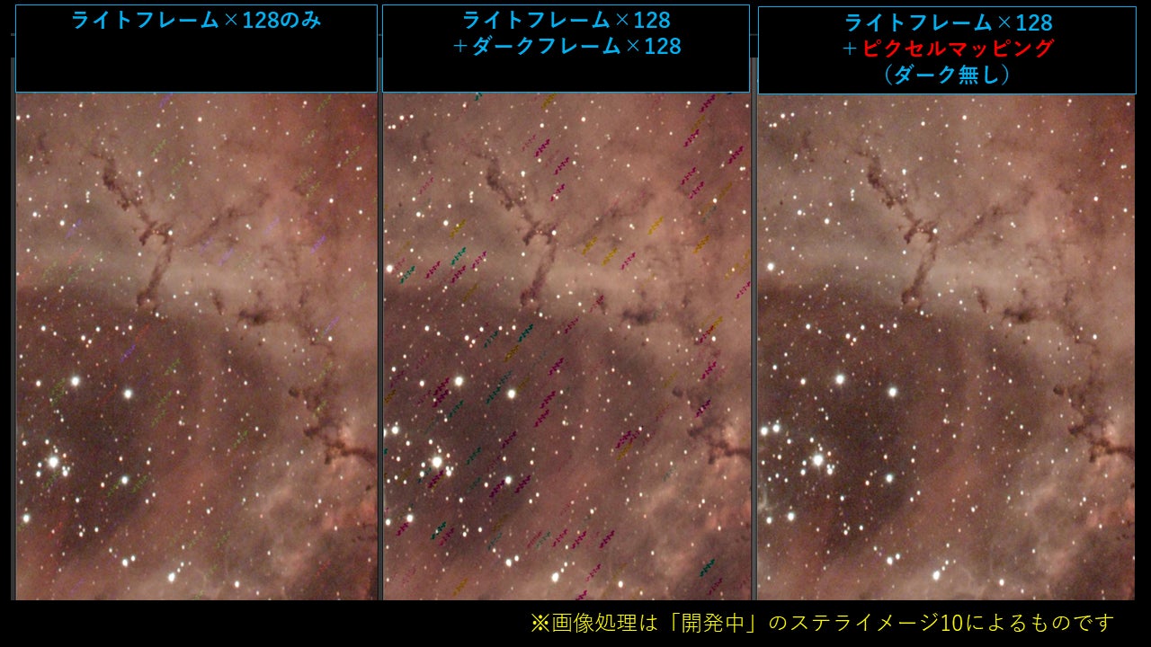 ステライメージ10には、これまでにない強力なノイズ処理機能を搭載しました。天体写真家「あぷらなーと」氏の協力のもと、「ピクセルマッピング」「クールファイル補正」「コスミカット」「マイナスピクセル値保護」といった新機能を搭載し、これまでの画像処理では除去しきれなかった天体写真特有の不快なノイズを除去します。どれも非常に有効な処理ではあるものの、操作が煩雑で手間がかかりすぎるという問題がありましたが、ステライメージ10ではこれを非常にシンプルなインタフェースで実現しています。