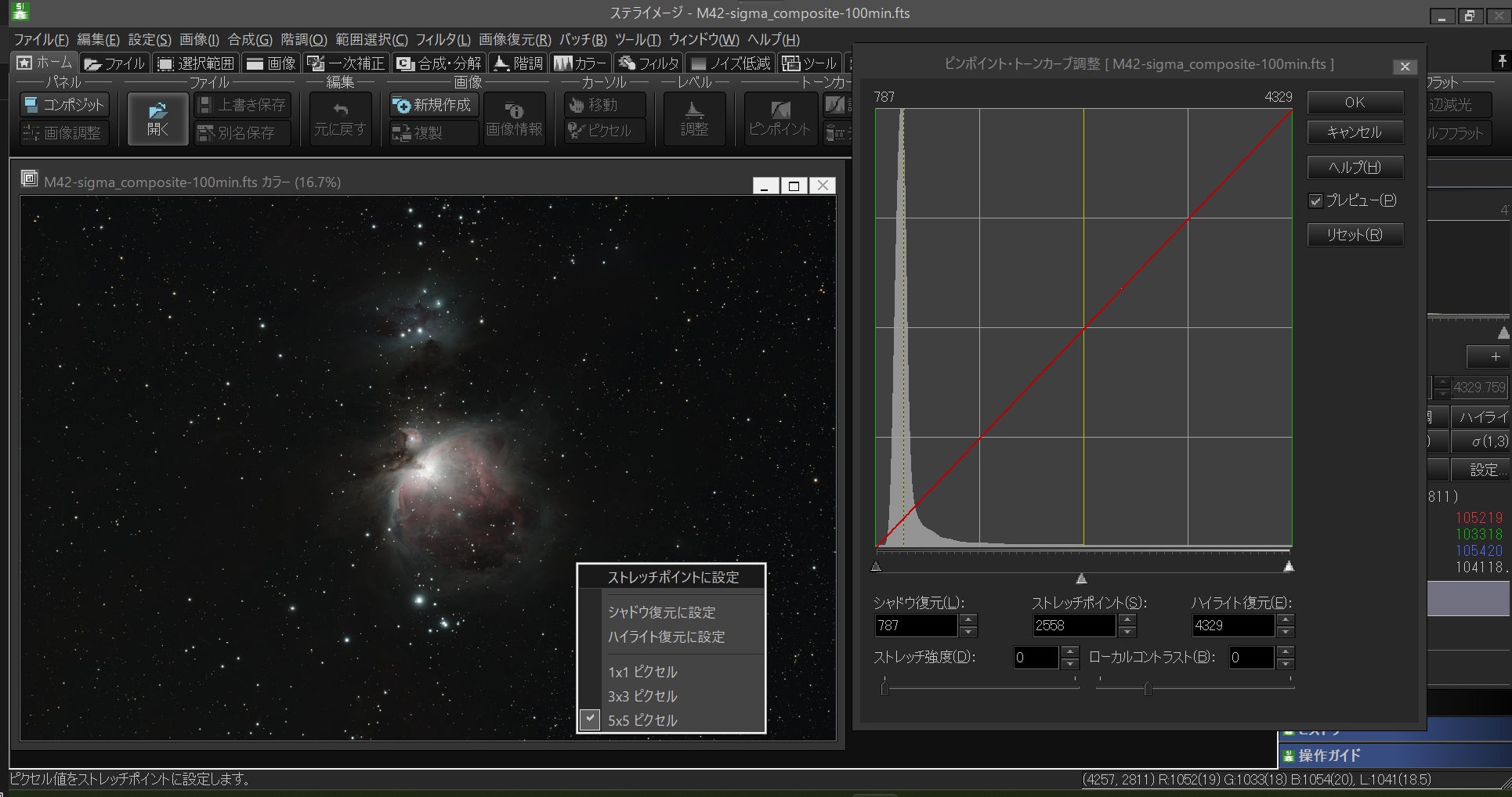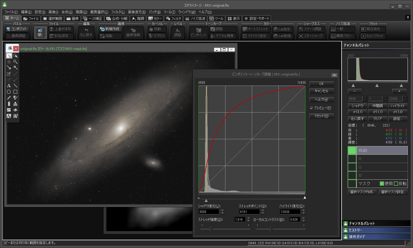 また、天体写真においては、星雲の淡い部分や分子雲などの特定の階調領域を強調し、見栄えの良い画像に仕上げることが重要です。そのためステライメージ10では、特定のレベル値を強力かつ滑らかにストレッチできる「ピンポイント・トーンカーブ調整」機能を搭載しました。トーンカーブ上の3点と、「ストレッチ強度」「ローカルコントラスト」という2つのスライダーの調整によって、驚くほど簡単に微細な構造を浮かび上がらせることができます。