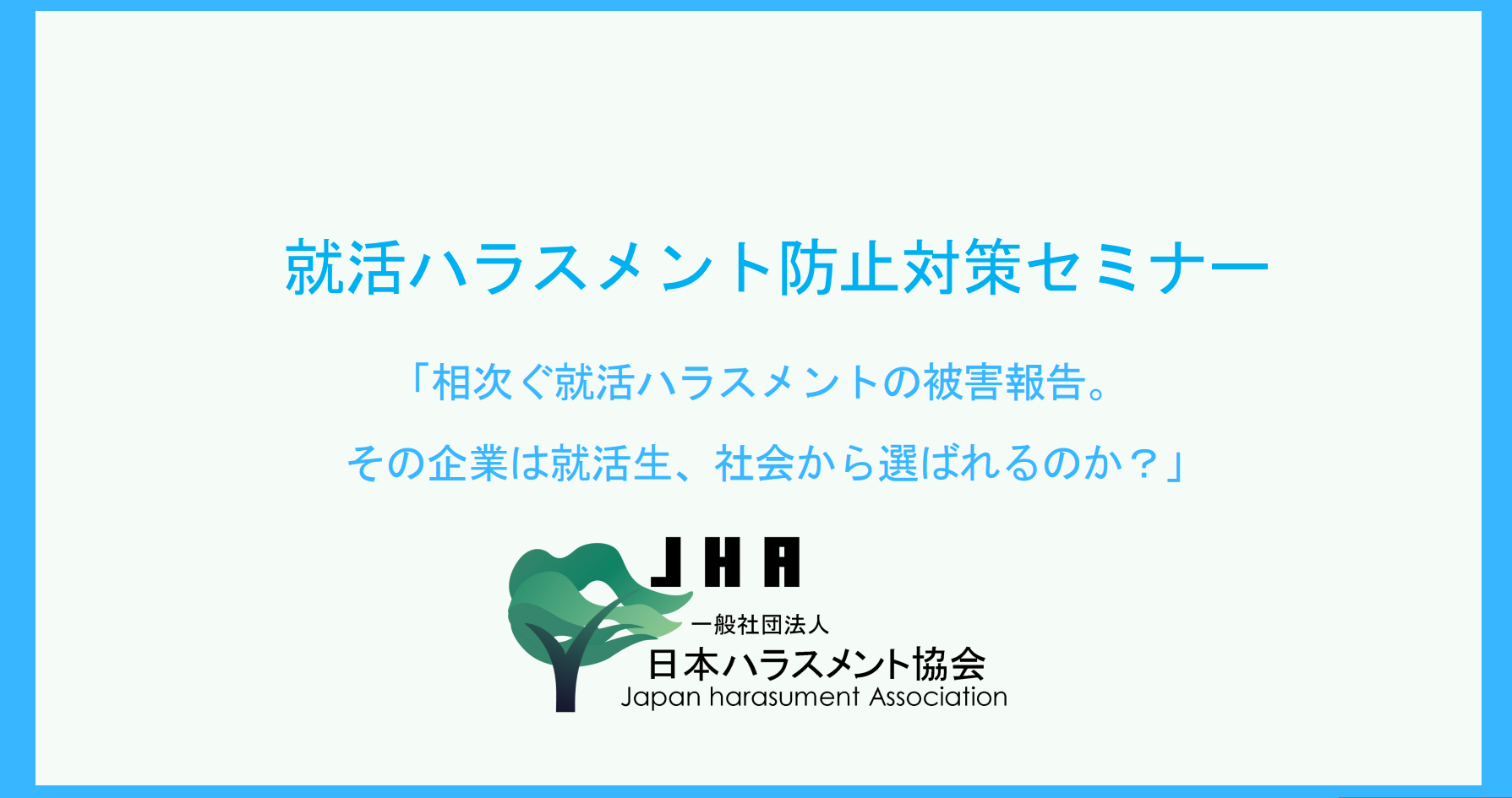就活ハラスメント事例を解説。経営者、人事担当者向けに30分で学べるセミナー動画を企業に無償提供。就活セクハラ、オワハラ対策、内定取り消しルールを再確認。日本ハラスメント協会がYouTubeに一般公開