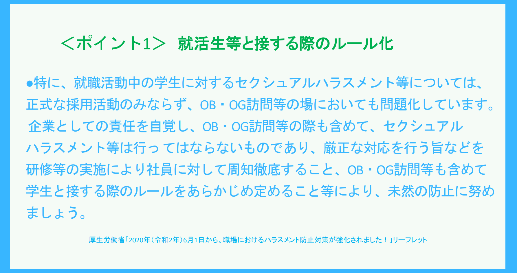 日本ハラスメント協会が2021年10月、厚生労働省雇用機会均等課に訪問し署名と提言書を提出し意見交換したこともあり、就活生へのハラスメント対策が一歩前進した背景があります。