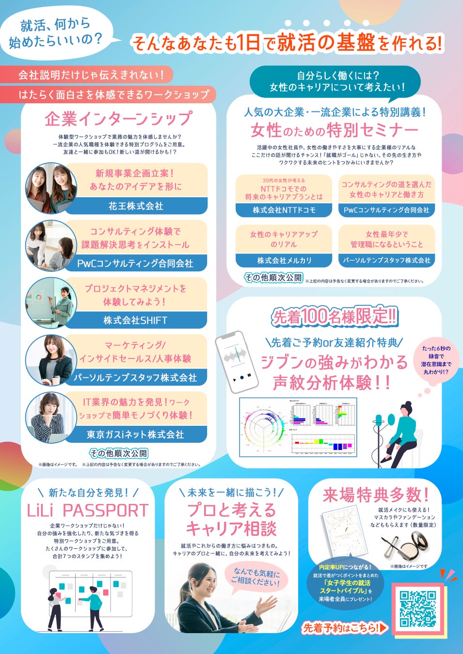 キャリアアップを目指す女子学生向けのキャリアプラットフォームを提供するLiLi株式会社(本社:東京都港区六本木7-2-29 代表取締役:廣岡絵美)は、パーソルテンプスタッフ株式会社様と共同で、キャリアアップを目指す女子学生向けの就活イベント「LiLi Internship EXPO for women」を開催しました。