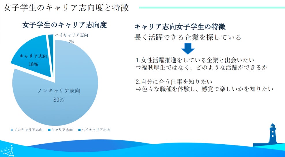 現在、「キャリア志向」を持った女子学生は全体の約20%程度と非常に少なく、依然としてノンキャリア志向が大半を占めております。