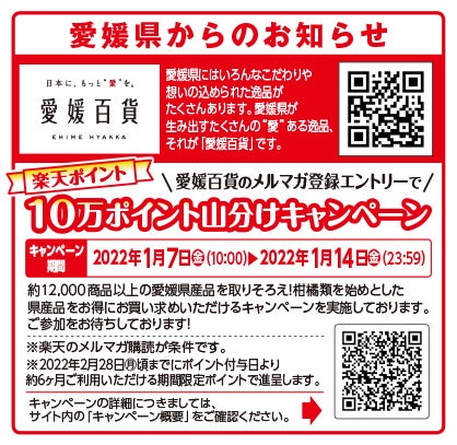 本フェアは、新型コロナウイルスの感染拡大の影響により、厳しい状況が続く地方のメーカー・生産者の方々を応援するための取り組みの一つです。愛媛県ならではの香り豊かな柑橘をはじめ、まるごとみかん大福などの地元で愛されるスイーツ、鯛めし弁当や焼豚玉子飯などのご当地グルメを種類豊富に取り揃えます。また、「愛媛百貨」のメルマガ登録エントリーで楽天ポイント10万ポイント山分けキャンペーンを実施いたします。ぜひ当店で愛媛自慢の逸品をご堪能ください。