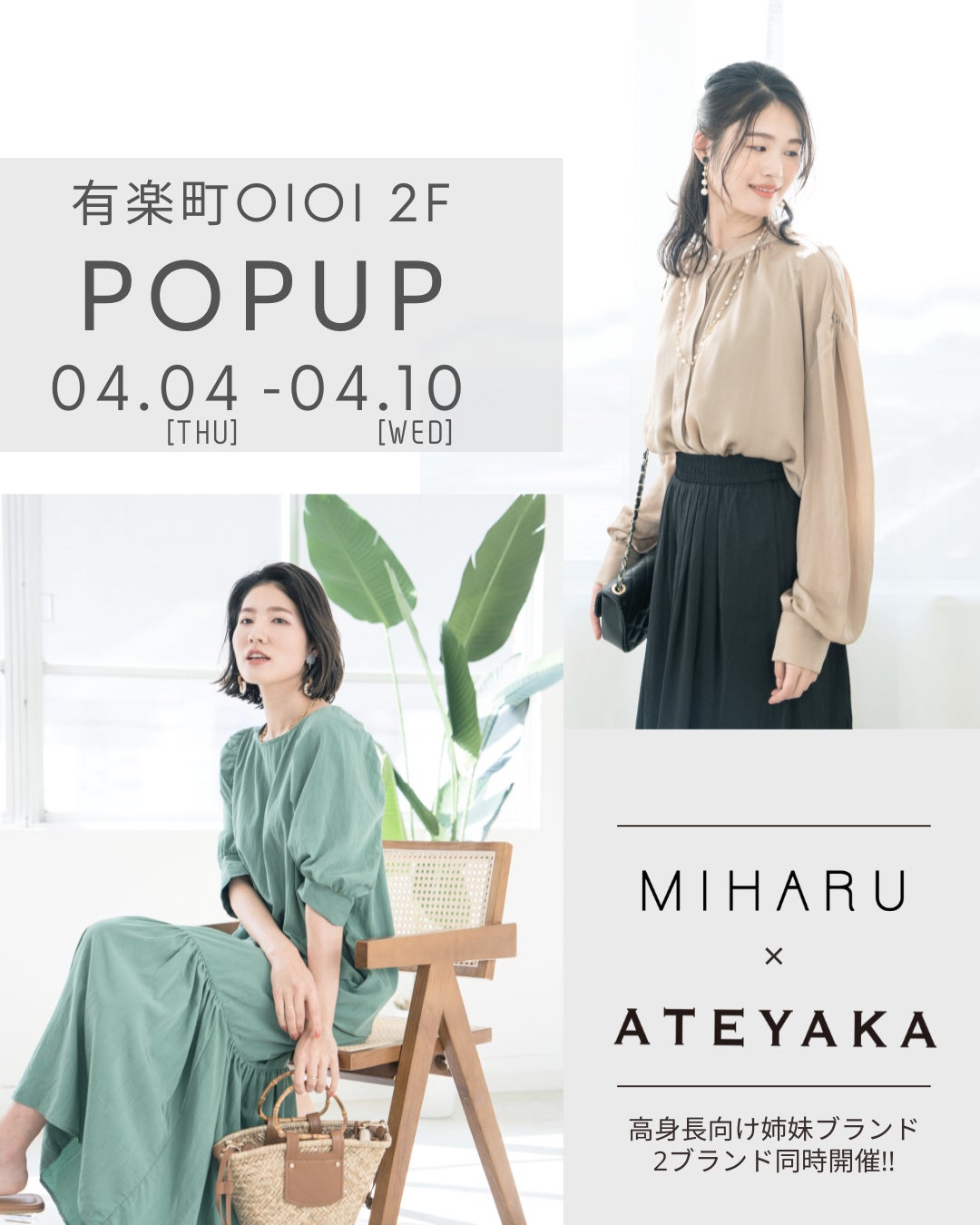 今季のATEYAKA, MIHARU新作アイテムをその場で試着、購入、お持ち帰りいただくことができます。2ブランド同時開催のため、トータルコーディネートもお楽しみいただけます。これまで気になっていたけどご試着ができずにいた方は、ぜひこの機会にポップアップストアにて実際に手に取っていただき、ATEYAKAとMIHARUのアイテムをお試しください。