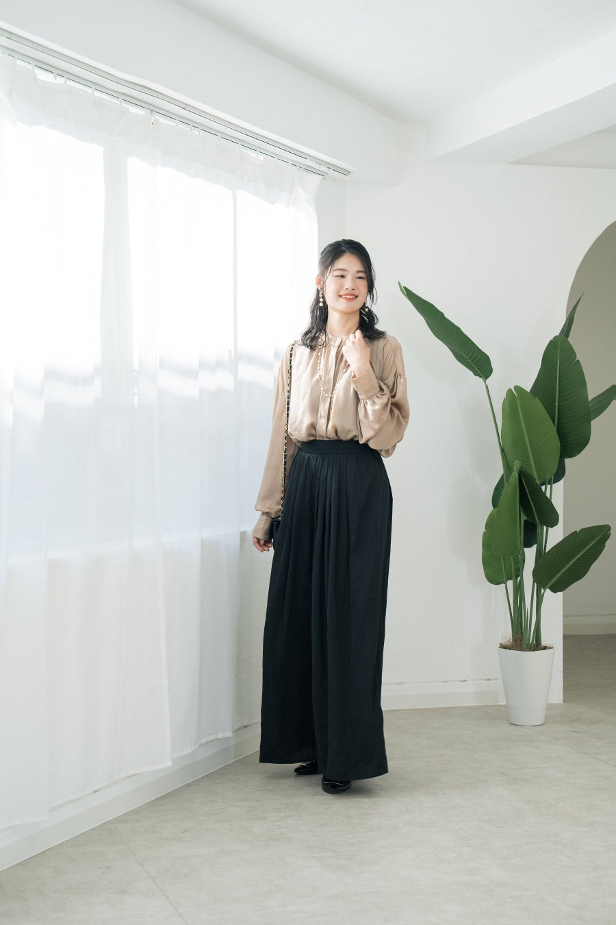 ウエスト総ゴムにもかかわらず、複数のタックがお腹をスッキリ見せてくれるのも嬉しいところ。たっぷりとした裾がクールすぎず、上品な柔らかさも出すことができ、シンプルなトップスと合わせても、ジャケットと合わせてクールに着こなすことができます。アイレットフリルブラウスと合わせた甘辛ブラックコーデもおすすめです。