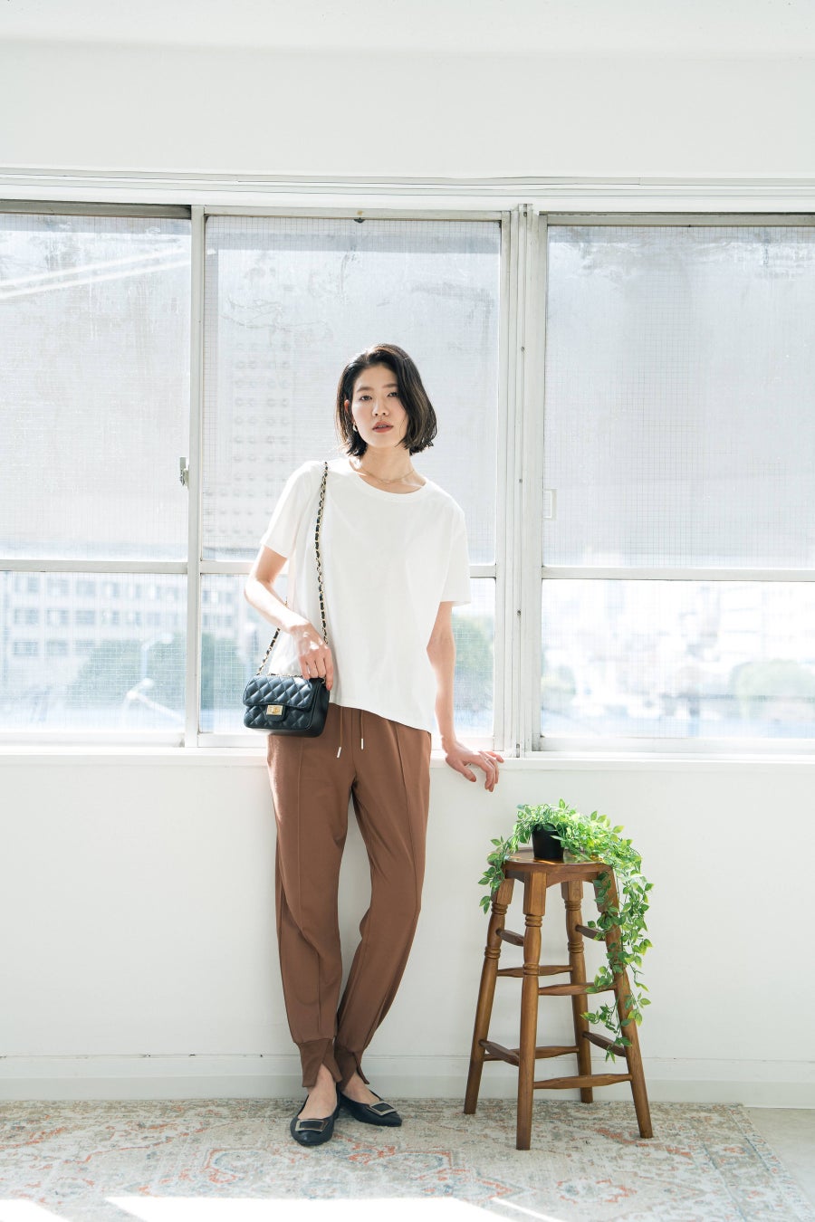 高身長女性泣かせのアイテム、ジョガーパンツ。レディースでは丈が足りず裾がふくらはぎに…というのは容易に想像が付きます。とはいえ、メンズのジョガーパンツではカジュアルすぎる。そんな高身長女性の悩みをATEYAKAが解決します。