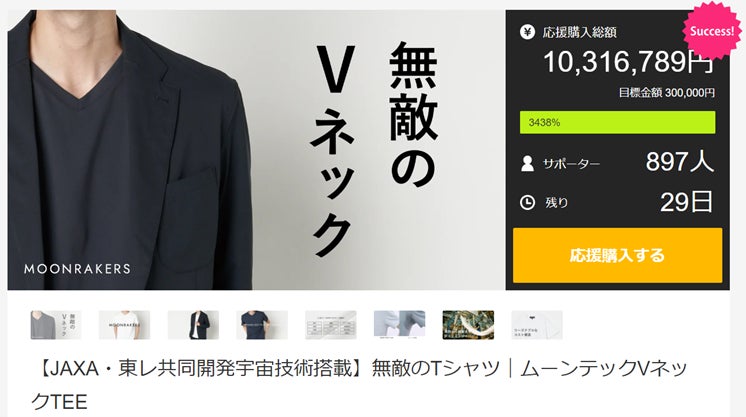 上記を踏まえ、「MOONRAKERS」は今回ユーザーより最も要望の多かった「MOON-TECH®」のⅤネック商品「MOON-TECH® Vネック TEE」を開発、あわせて素材から縫製まで日本での製造を行い製造各工程に適切な収益を渡しつつ、ユーザーの買いやすいリーズナブルな価格設定にも挑戦したプロジェクトを応援購入サービス「Makuake」で実施。大きな反響を呼んでいます。