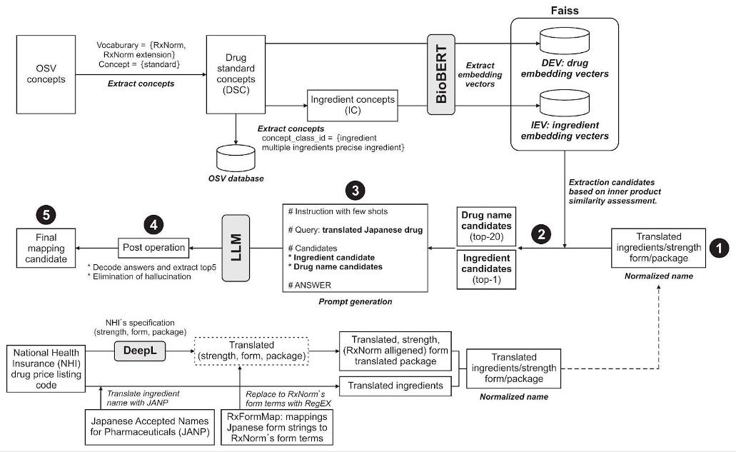 fig. LLMとRAGを組み合わせた薬物概念マッピング システムのワークフロー( Eizen Kimura, Yukinobu Kawakami, Shingo Inoue, Ai Okajima. (2024). Mapping Drug Terms via Integration of a Retrieval-Augmented Generation Algorithm with a Large Language Model. Healthcare Inform Research, 30(4): 355-363. https://doi.org/10.4258/hir.2024.30.4.355)