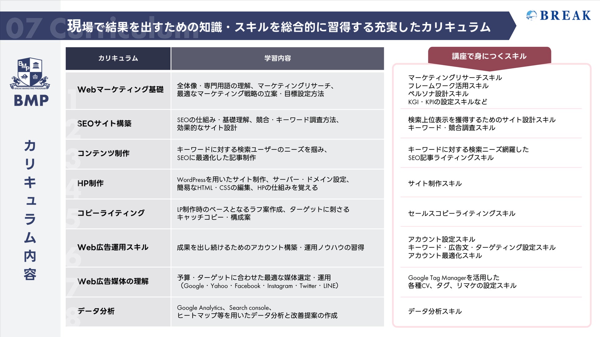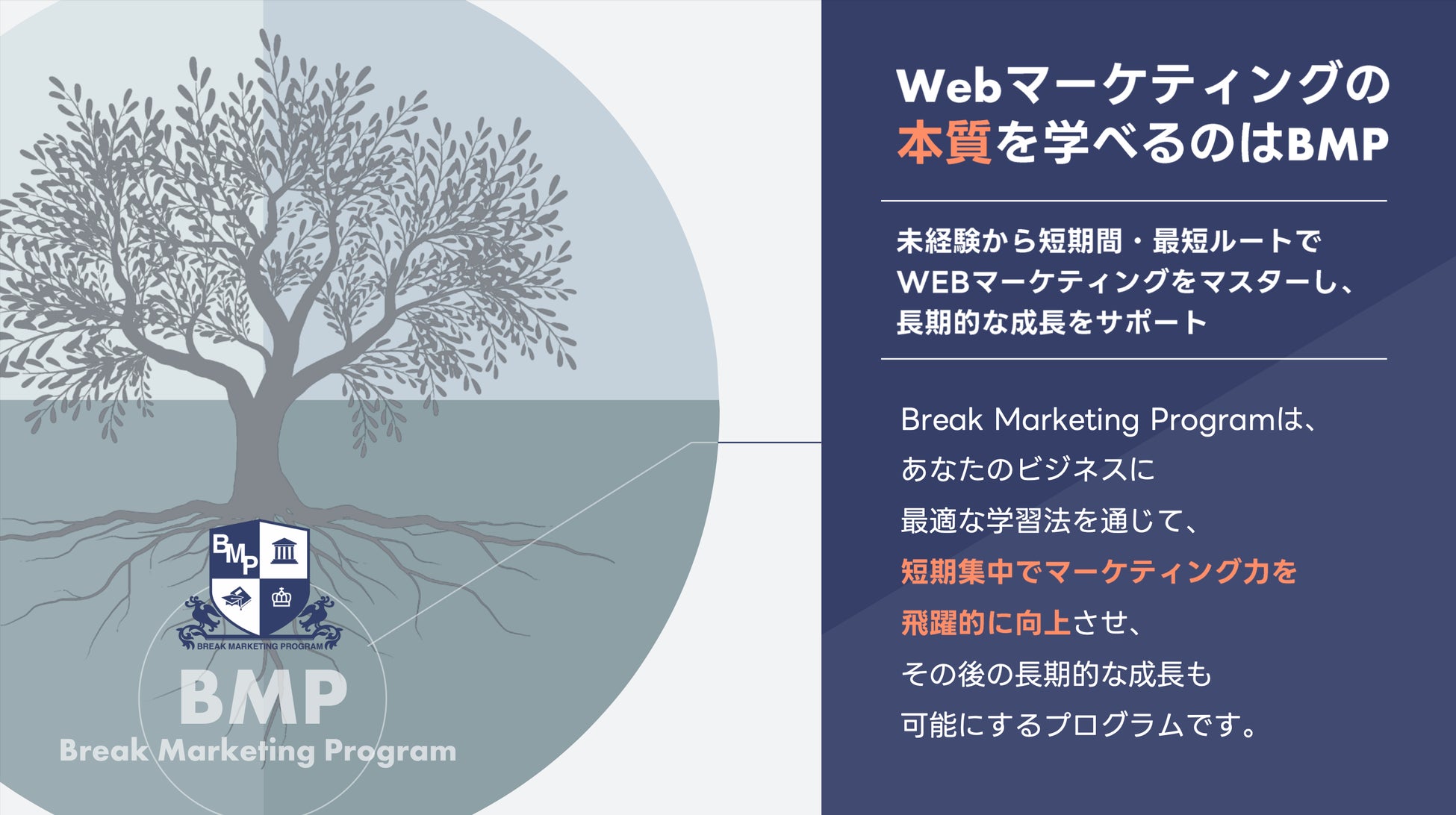 「BMP(Break Marketing Program)」とは、未経験者や初心者がゼロからWebマーケティングを習得するためのオンラインスクールです。