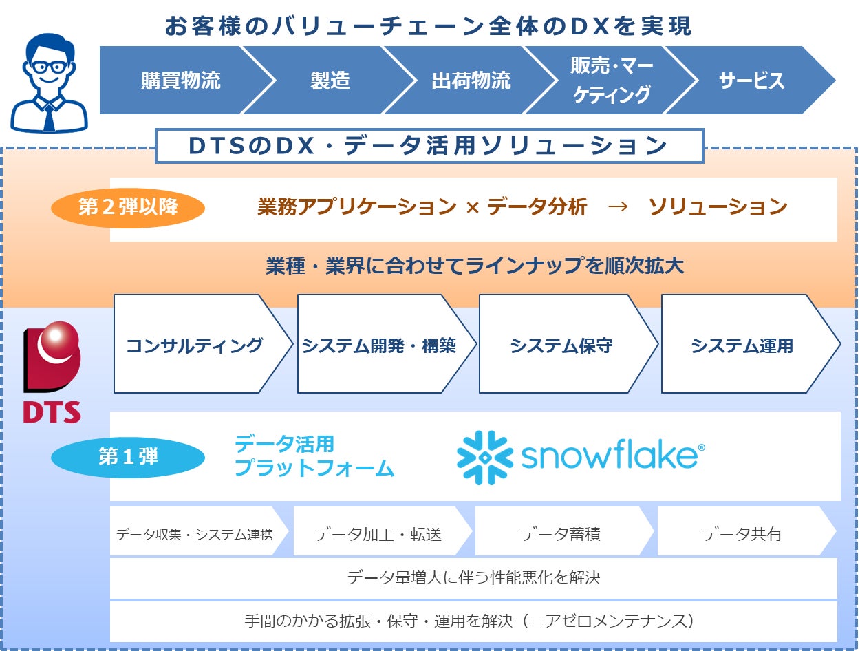 DTSはこうしたデータ活用プラットフォームを中心に、これまで培った業務ノウハウを活かし企業のデータを効果的に活用するための業務アプリケーションとデータ分析を掛け合わせた「DX・データ活用ソリューション」のラインナップを順次拡大。お客様のバリューチェーン全体のDX実現に向けてコンサルから構築・運用までワンストップで支援してまいります。