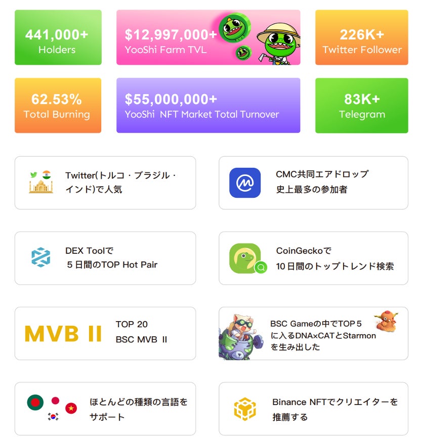 またGenesisNFTのブラインドボックス販売などを介して、NFTマイニング、NFT HashRateアップグレード、FARMリキッドマイニングなどYooShi Launchpad独自の仕組みを用い、プロジェクトを支援しています。