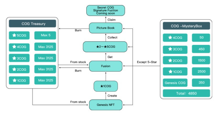 ジェネシスNFT価値分析:ジェネシスNFTの所有者は、トレジャリー(Treasury)に在庫がある限り、継続的に★1レアリティのCOGを生産することができます。ジェネシスNFTを用いて、自らのコミュニティを建設、運営することが可能ですが、例えば、コミュニティ建設に貢献したメンバーにCOGをエアドロップする等、DAOガバナンスを構築する際に活用できます。また、ジェネシスNFTはDAOに最適なツールとして、Web3.0により多くの可能性をもたらしています。