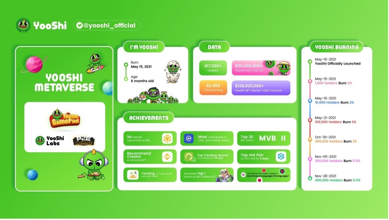 OVOと共同で出展することになったYooShiは50万人以上のユーザー数を抱えている人気プロジェクトです。2021年5月からサービスを開始しており、初期段階におけるMemeコインからNFT+GameFiインキュベーター、およびGameFiメタバースプラットフォームへと発展しました。