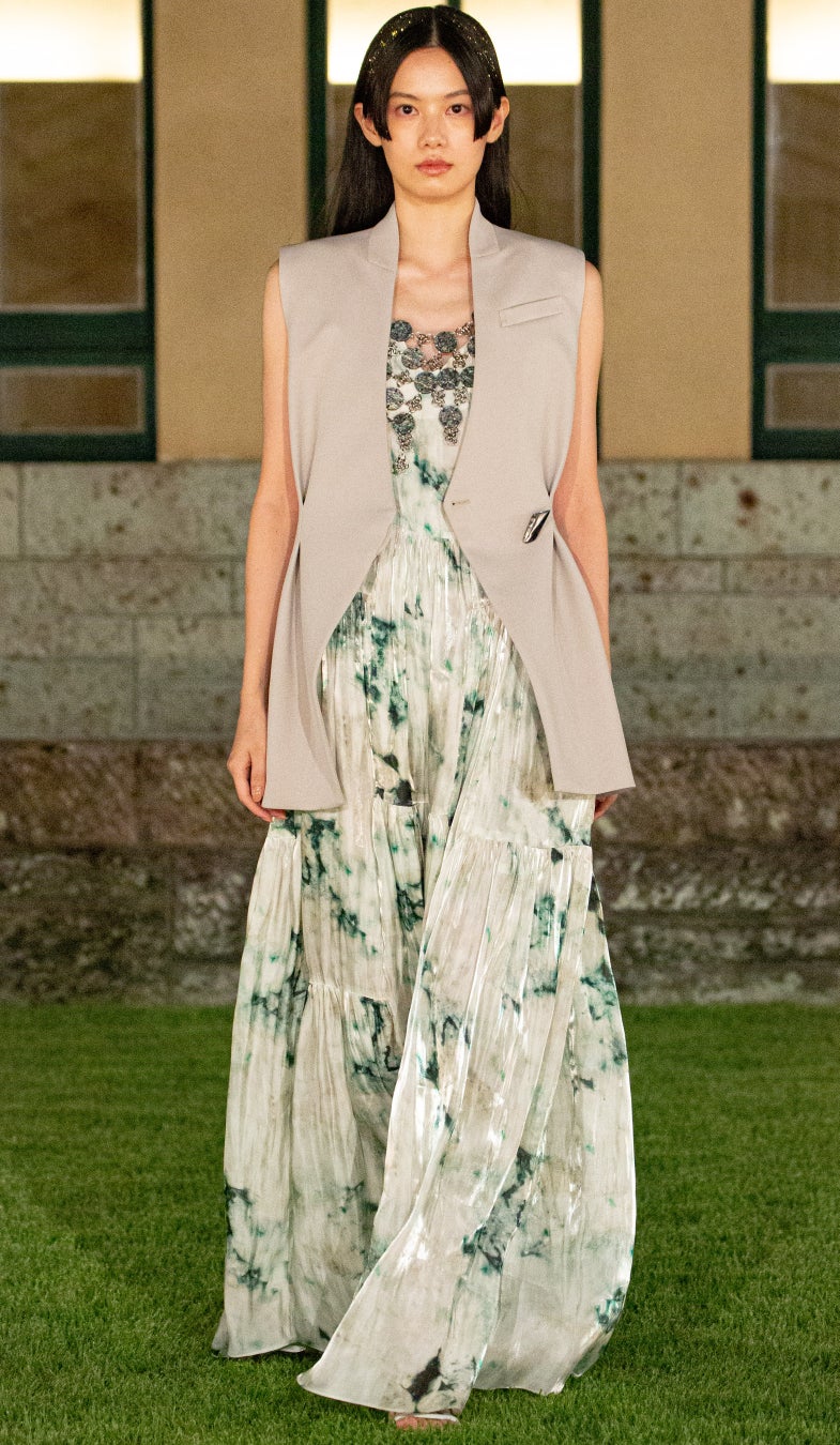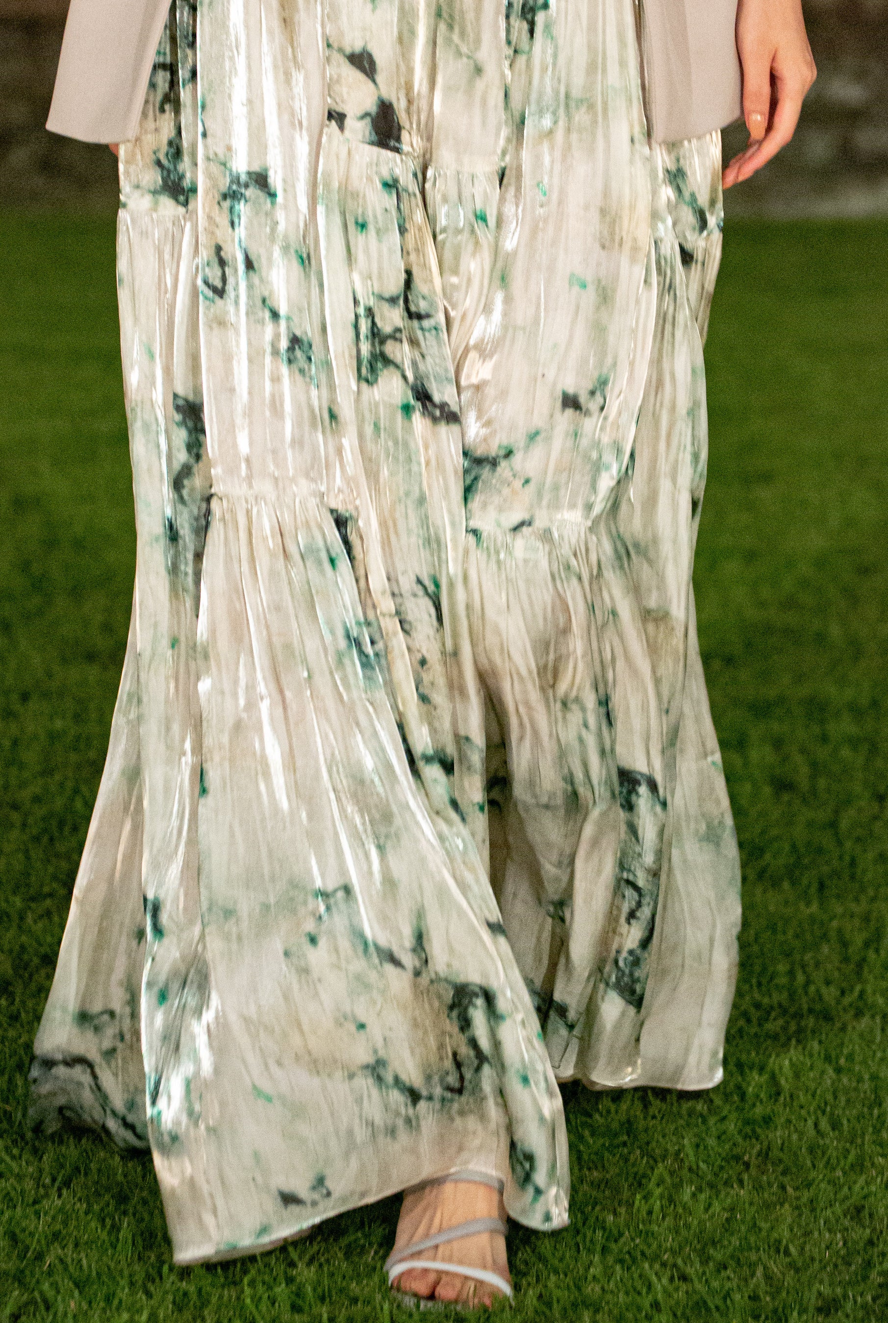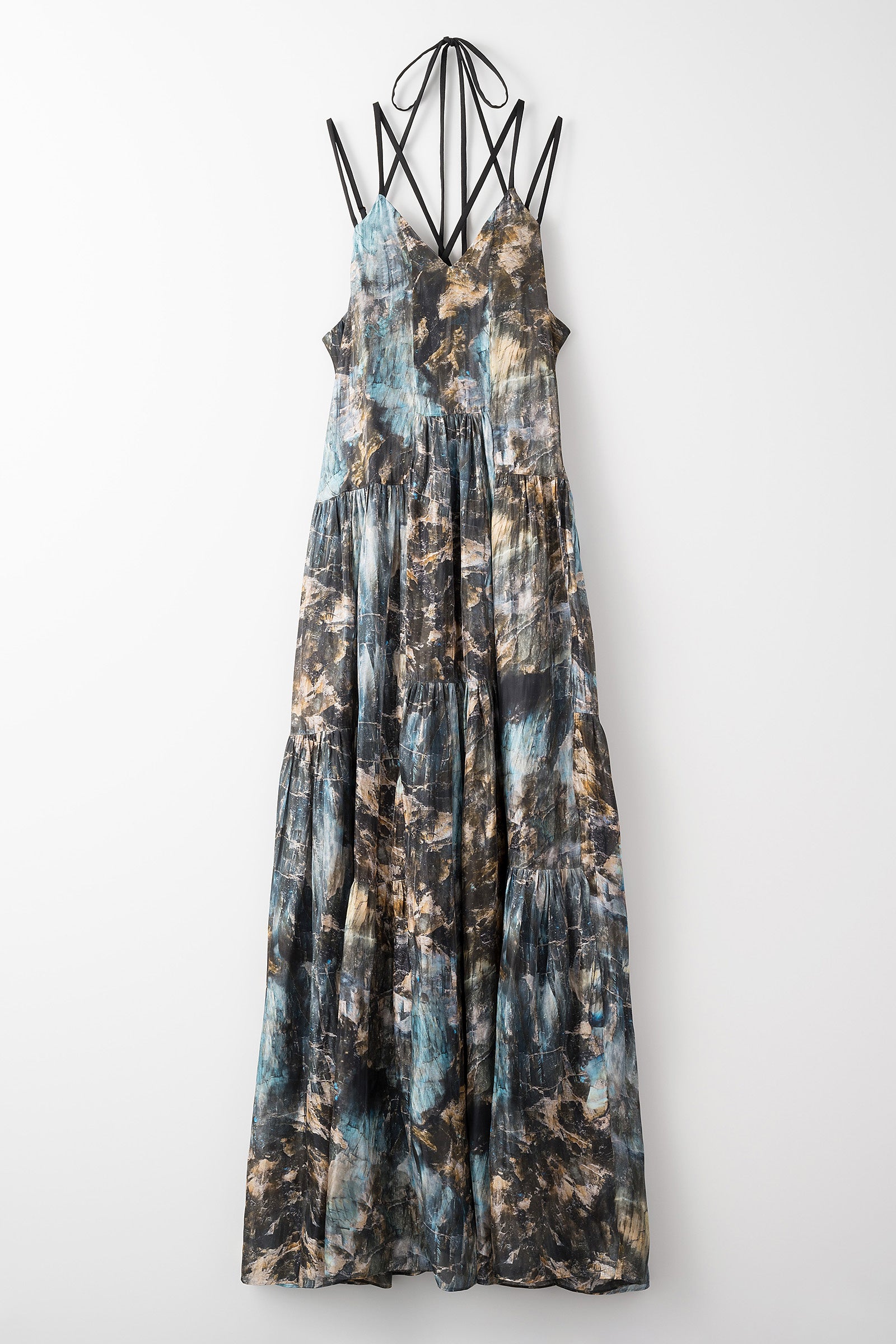 Oreシリーズのドレスは、ラブラドライトと翡翠の自然な色彩を大胆なプリントで表現。割繊糸を仕様した薄手の素材で光の当たり方により光沢感が変わるため、ドラマチックでありながらセンシュアルな雰囲気を放ち、動くたびに軽やかで美しく揺れるシルエットとなっています。