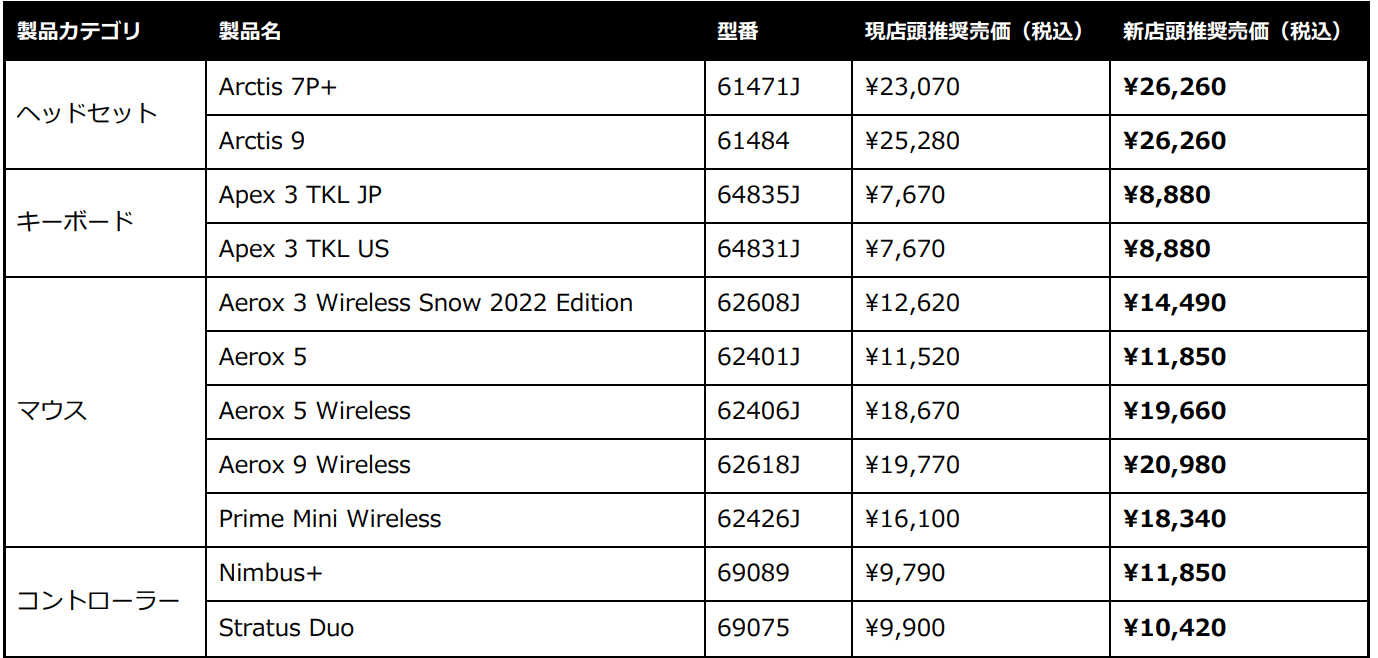 【SteelSeries】日本国内の一部製品販売価格改定のお知らせ