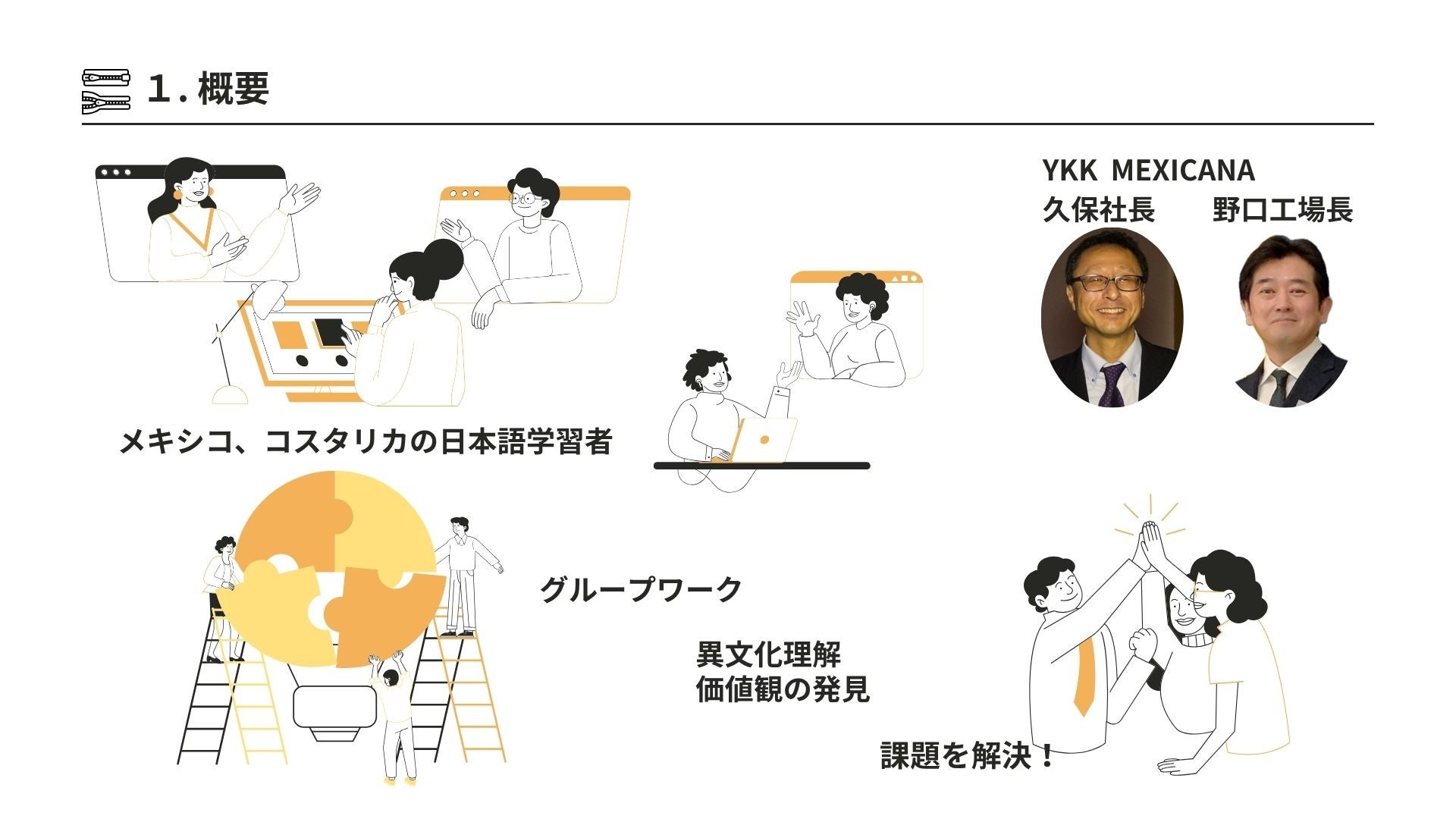本プログラムでは、YKKメキシコ社が提示する人材エンゲージメントに関する課題をテーマに、富山高専の学生がメキシコおよびコスタリカの学生と国際的に協働しながら、ディスカッションを通して解決策を探究し、提案を行います。