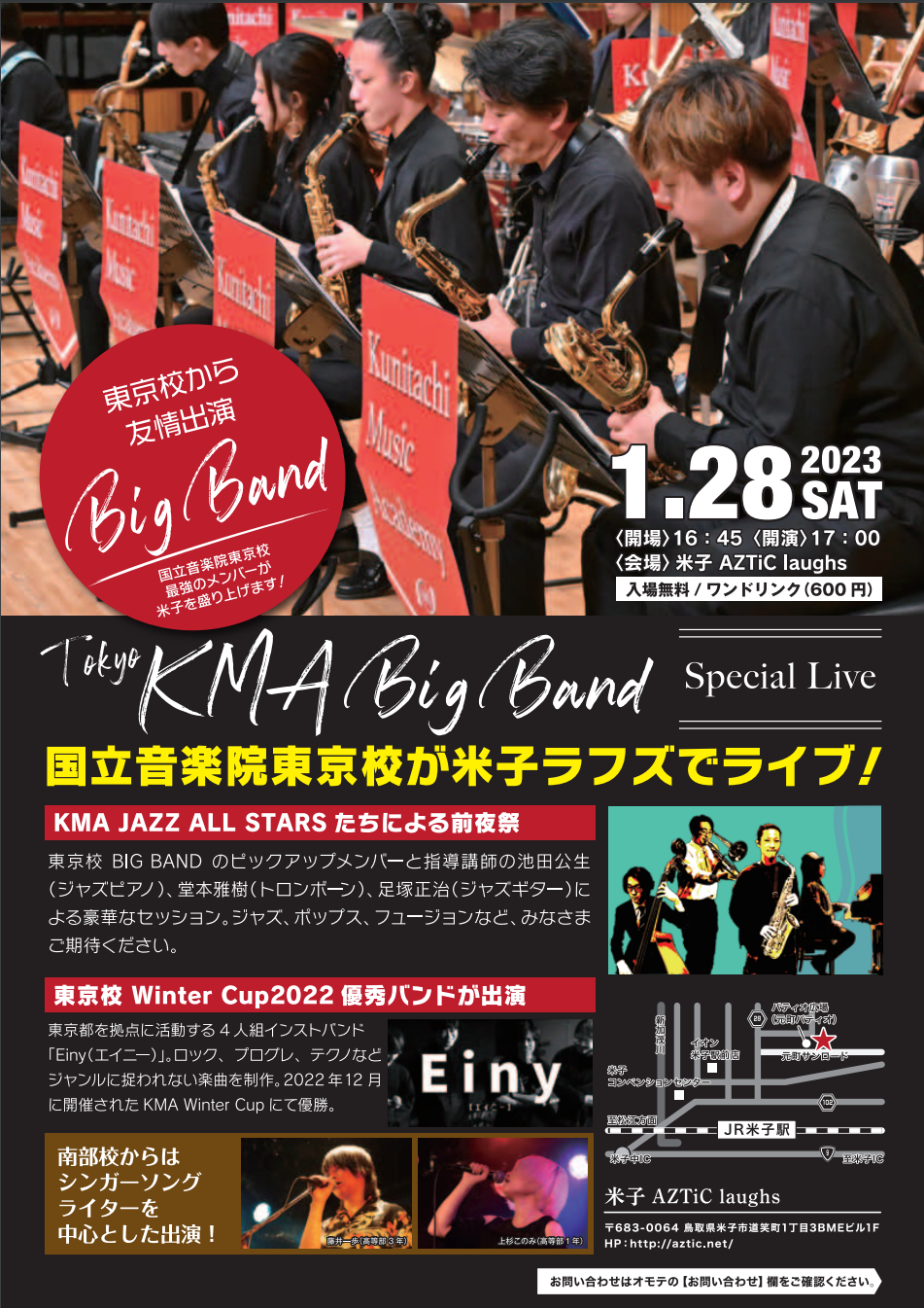 KMA BIG BANDのピックアップメンバーに指導講師の池田公生(ジャズピアノ)、堂本雅樹(トロンボーン)、足塚先生(ジャズギター)をゲストに迎えた豪華なジャズセッションを予定しています。