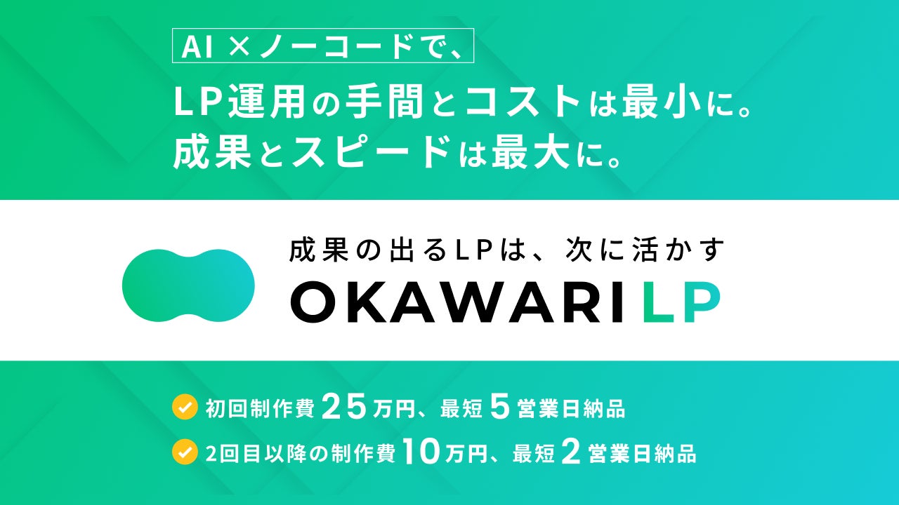 「OKAWARI LP」は、定期的にLP制作を行っている企業向けの、AI×ノーコードのLP制作サービスです。AIとプロフェッショナルの力を組み合わせることで、ローコストでもスピーディーかつ高品質なLPを提供します。