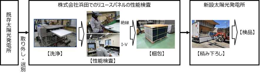 株式会社浜田は、使用済み太陽光パネルを選別・検査した後に、性能合格品を国内外へ販売しており、今回株式会社エックス都市研究所が建設した太陽光発電所では、全て株式会社浜田が調達したリユースパネルを使用しています。