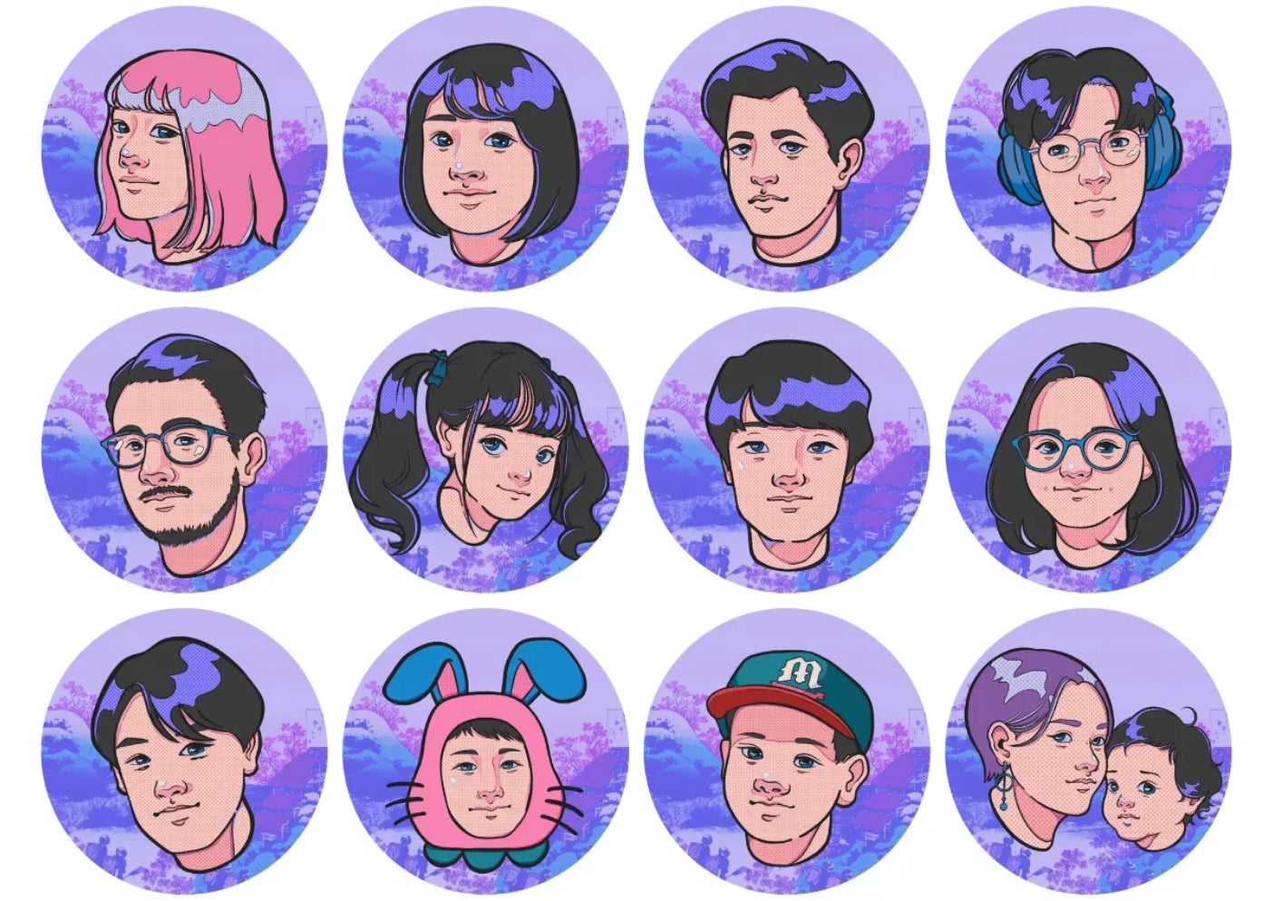 また、福利厚生の一環で「Hokusai Team Collectives」(図2)というメンバーの似顔絵をイラスト化したNFTが配られており、サービスロゴとチームアイコンのクオリティのバランスが悪いことが挙げられていました。「Hokusai Team Collectives」の制作者であるイラストレーターのhataさんに視認性が高く、Hokusaiオリジナルの世界観が訴求できるロゴの制作をしていただきました。(図1:after)