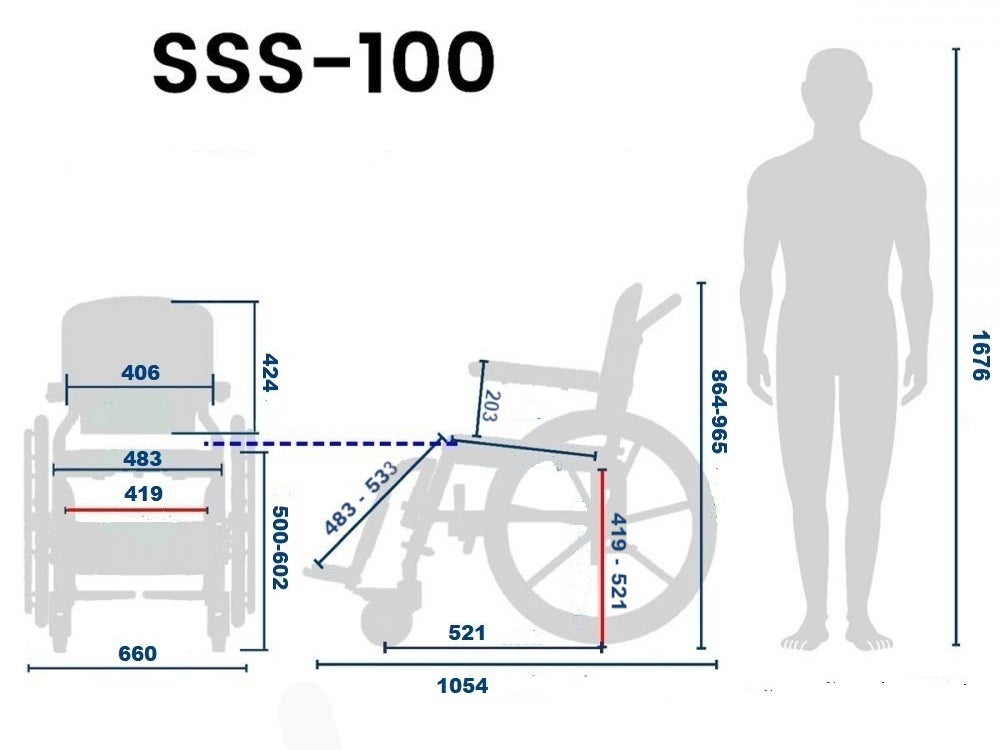 日本のJIS T9201(車いすの寸法)で大きさが規定されていますが、本製品は国際規格であるISO 7193、7176/5に基づいているため若干幅が広いです。