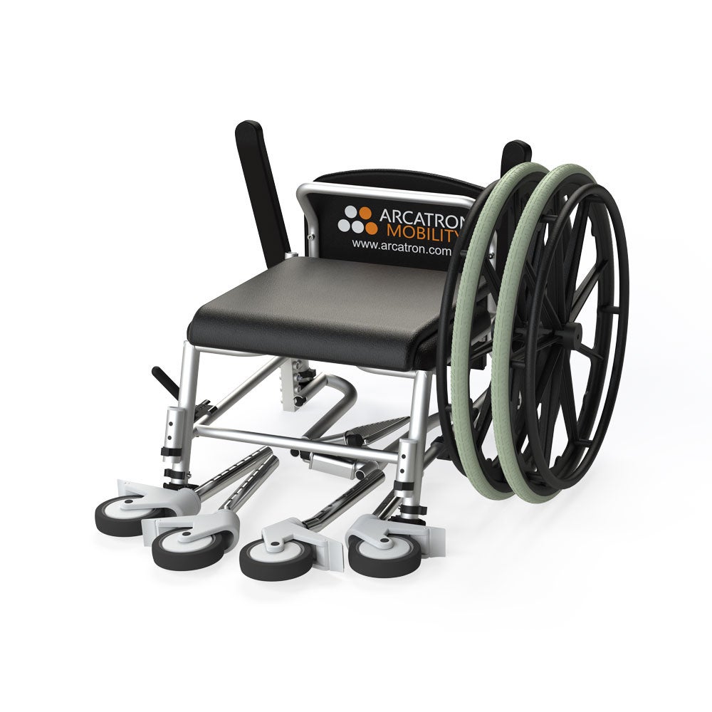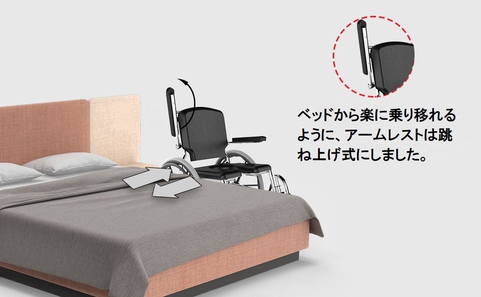 アルカトロンモビリティ社の車椅子は用を足すために座面に穴が開いていて、車椅子のままトイレの便器に覆い被さり、そのまま用を足すことができる。また、アームレストが跳ね上がるのでベッドからの乗り移りも容易です。