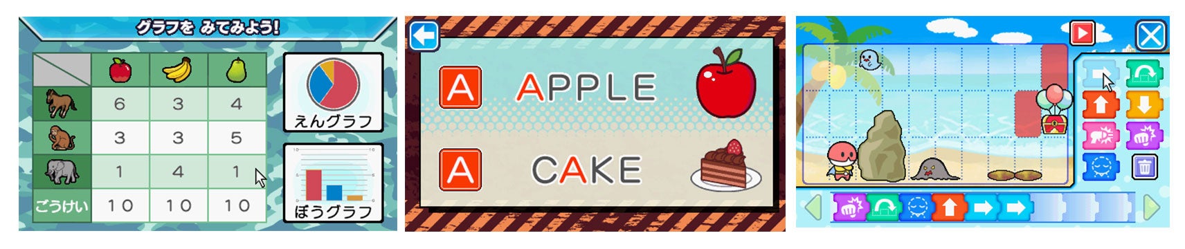 ゲーム感覚で学ぶことができるプログラミング学習メニューは、難易度別で3つのアプリを収録し、⼿厚いチュートリアルで3才から楽しく簡単に実践することができます。