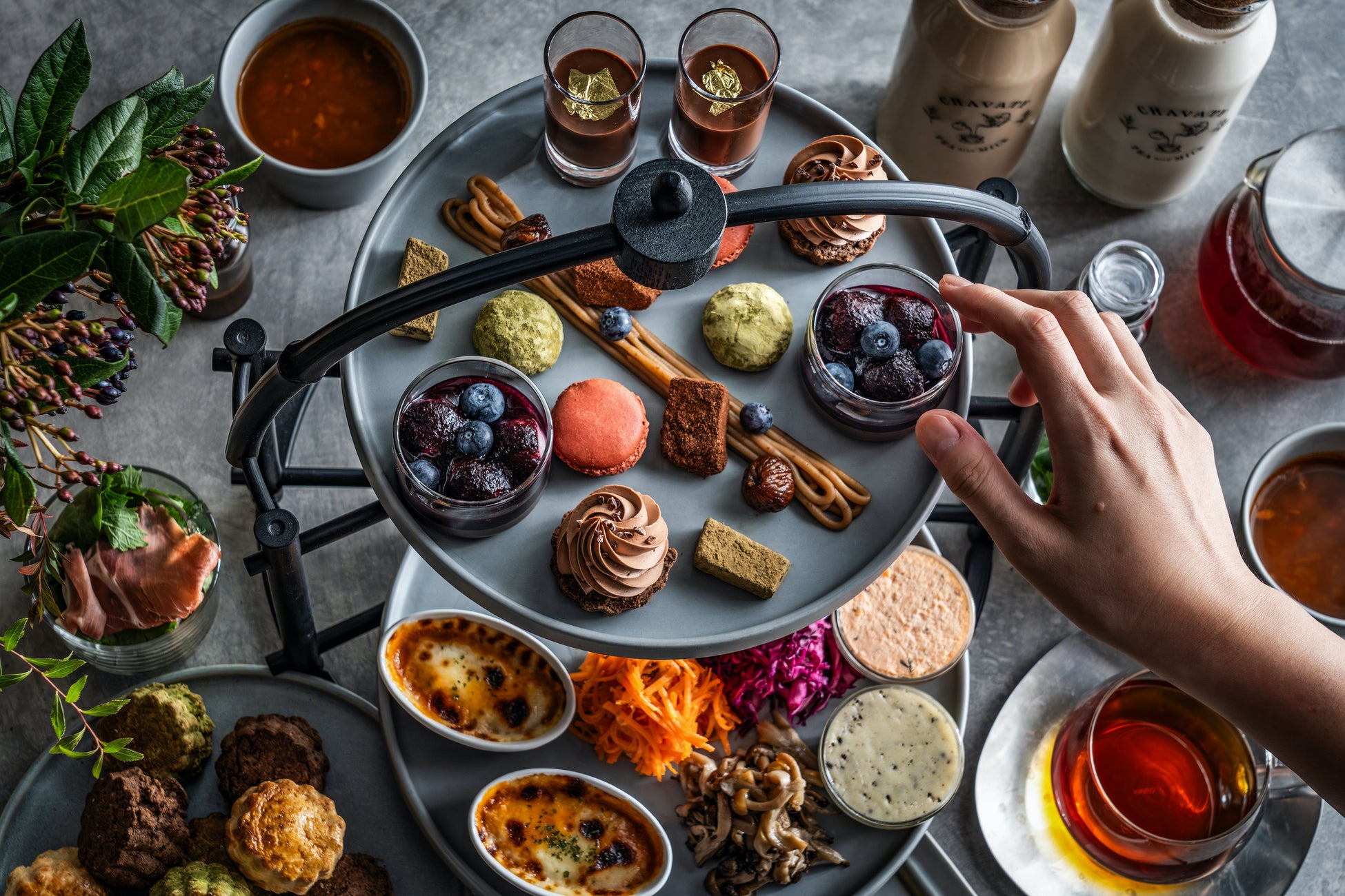 オータムパレット・アフタヌーンティーでは、嵐山の秋の荘厳な佇まいや、温もりを感じる色調の深みといった奥深い魅力を、季節の素材感や風味を引き出しながら表現しています。CHAVATY厳選のお茶を使ったオリジナルのティースイーツには炭火で焙煎した香ばしいほうじ茶や、爽やかでフルーティーな香りが特徴の凍頂烏龍茶を使用し、お茶の持つ香りの豊かさを活かしました。また、ペルー指定農園のオーガニッククーベルチュール「アルトエルソル」を使用したチョコレートスイーツは、力強くビターな味わいとフルーティーなアロマで、なめらかな光沢感や濃密な味わいに、華やかさを際立たせています。