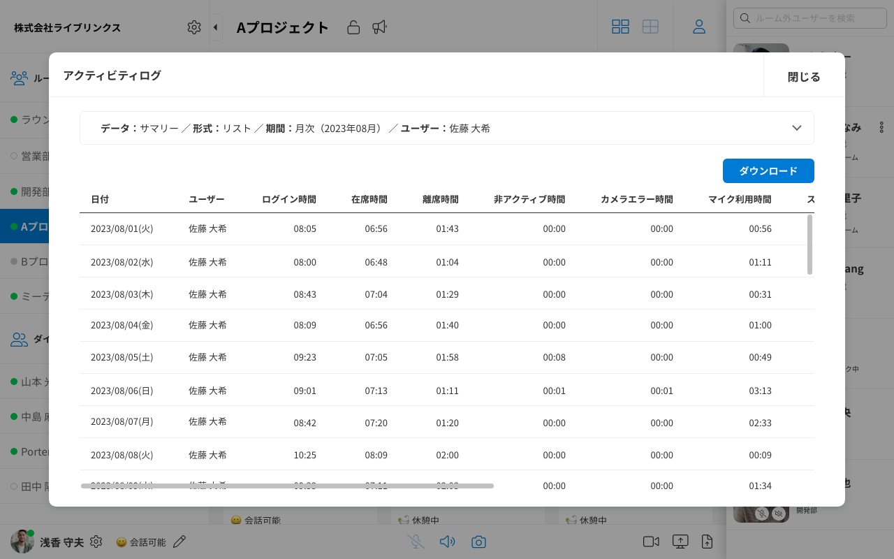 LIVEWORKでは、ユーザーのプレゼンス(在席状態)や各種操作をアクティビティ(行動履歴)として管理し、集計・データ出力を可能とするアクティビティログ機能の提供を開始しました。