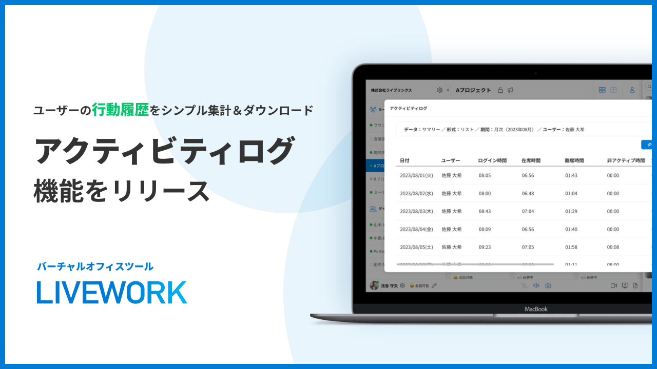 仮想オフィスツールLIVEWORK(ライブワーク)、ユーザーの行動履歴を可視化・リモートワークの透明性を高めるアクティビティログ機能をリリース