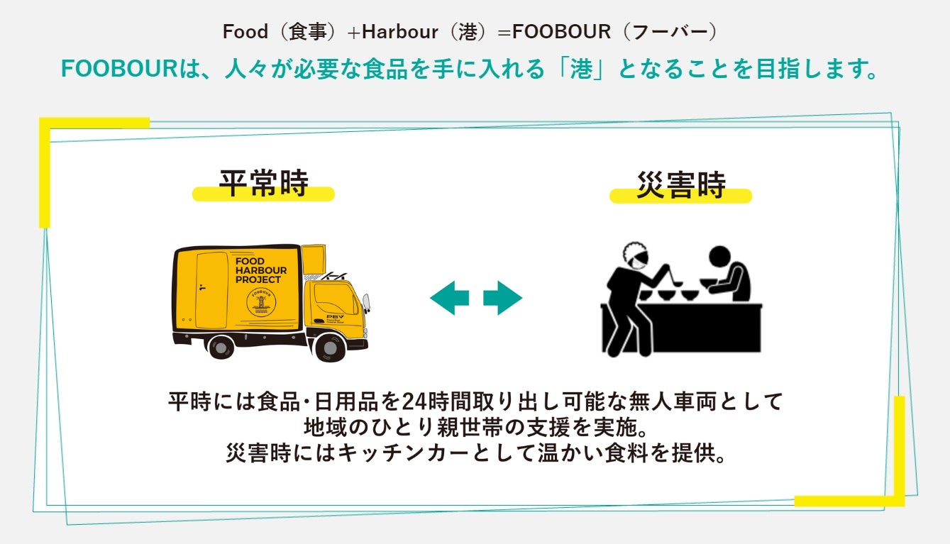 本プロジェクト「FOOBOUR(フーバー)」は、キッチンカーを活用し、平常時は困窮するひとり親家庭に食料品や日用品を、災害時は被災地に温かい食事を届けます。「平常時(いつも)の備えが、災害時(もしも)にそのまま役立つ」というフェーズフリーの理念に基づき、子どもの貧困と災害支援という2つの社会課題の解決を目指します。