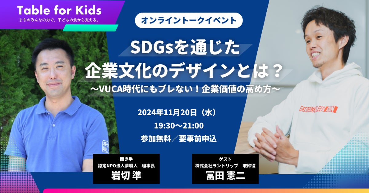 首都圏の子どもや若者を対象とした社会教育や社会福祉に取り組む認定特定非営利活動法人夢職人(本社:東京都江東区、理事長:岩切準、以下:夢職人)は、ランニングを楽しむ人々へ向けたサービスを展開する株式会社ラントリップ(本社:東京都渋谷区、代表取締役:大森 英一郎、以下:ラントリップ)の取締役であり、「企業文化をデザインする」の著者である冨田憲二氏をゲストに迎え、「SDGsを通じた企業文化のデザインとは?~VUCA時代にもブレない!企業価値の高め方~」と題したオンライントークイベントを2024年11月20日(水)19時30分から開催します。