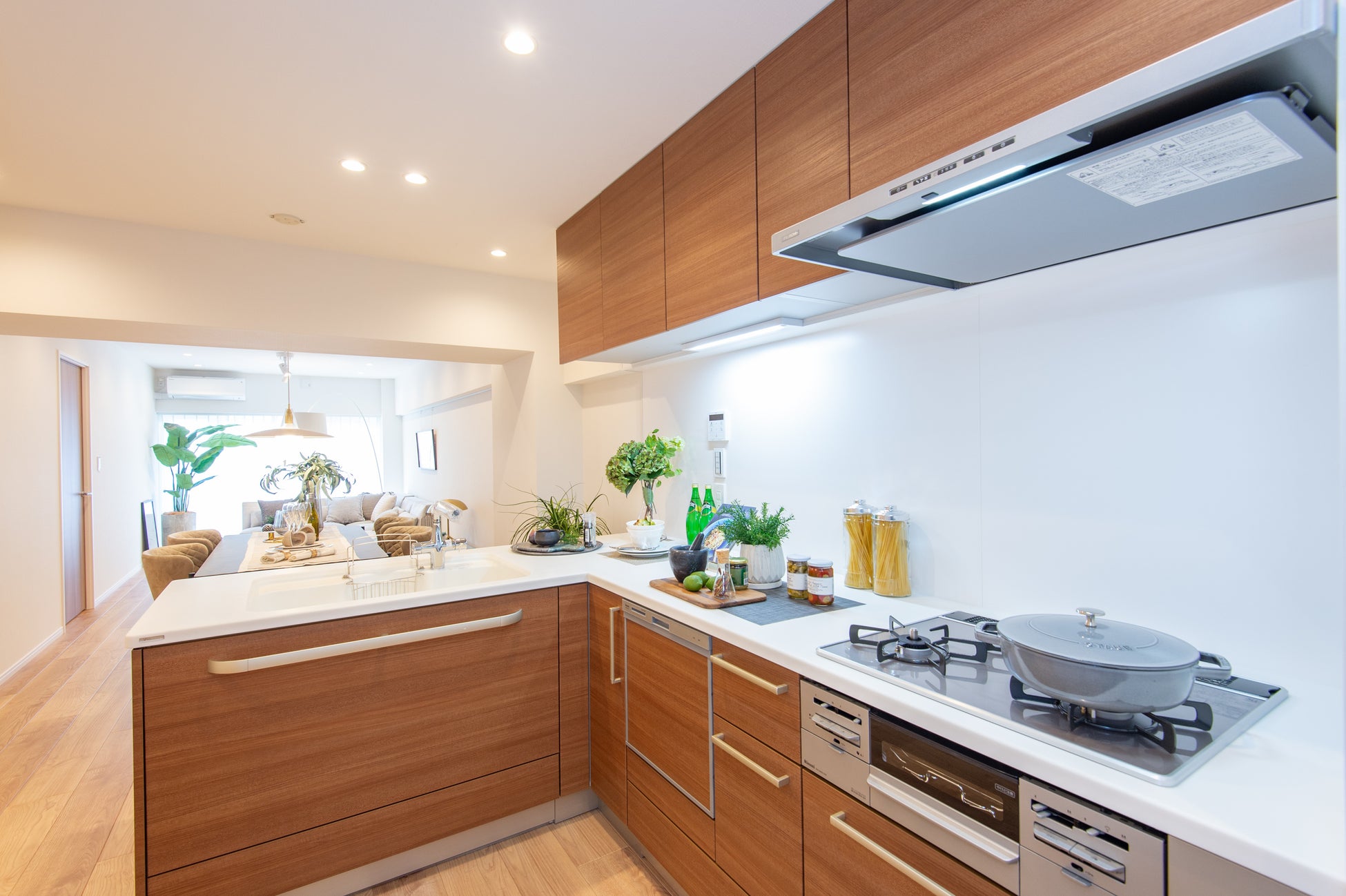 約22帖もの広々としたリビングダイニングキッチンでは、ゆったりとしたひと時を過ごせます。キッチンは、作業スペース・収納スペースともに広く確保されたL字型のシステムキッチンは。お部屋の雰囲気に調和し、木のぬくもりが溢れるデザインです。