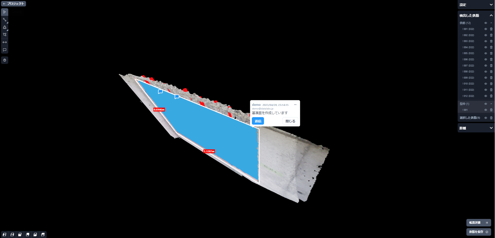 iPadで斫り箇所をスキャンし、点群をアップロード。基準面を作成すると自動で必要な生コンやモルタル量数量算出が可能となります。生コン打設時にもリアルタイムに必要打設量等をその場で算出可能。斫り深さやかぶりの確認等の出来形検査も行い、発注者にもクラウド経由でデータを共有しWeb上で検収が完了できます。現況配筋モデルも自動作成するため、BIM/CIM対応や維持管理等での活用にも対応することが出来ます。