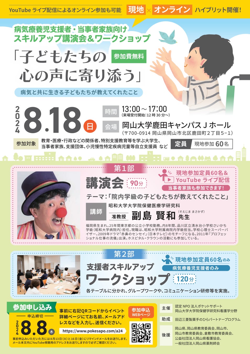 認定NPO法人ポケットサポート(岡山県岡山市、代表理事:三好祐也)は、2024年8月18日(日)に現地開催&YouTubeライブ配信にて『病気療養児支援者・当事者家族向けスキルアップ講演会&ワークショップ』を開催します。