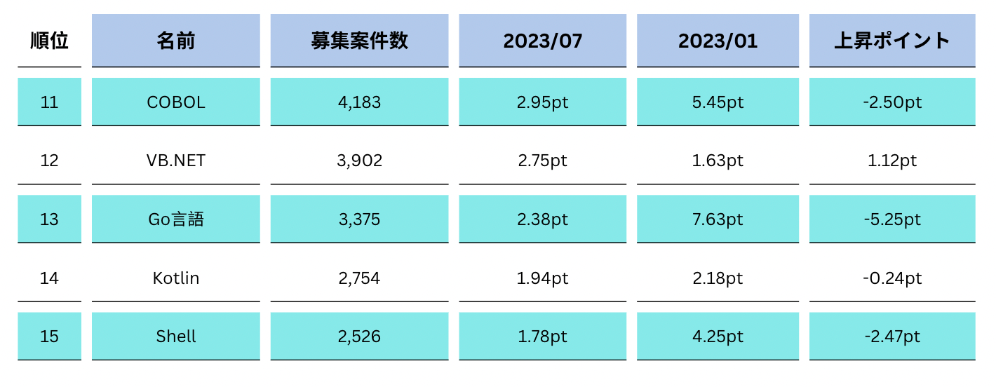 ▼フリーランスエンジニア向け「開発言語ごとの案件割合」上位11-15位(2023年7月 / 2023年1月)