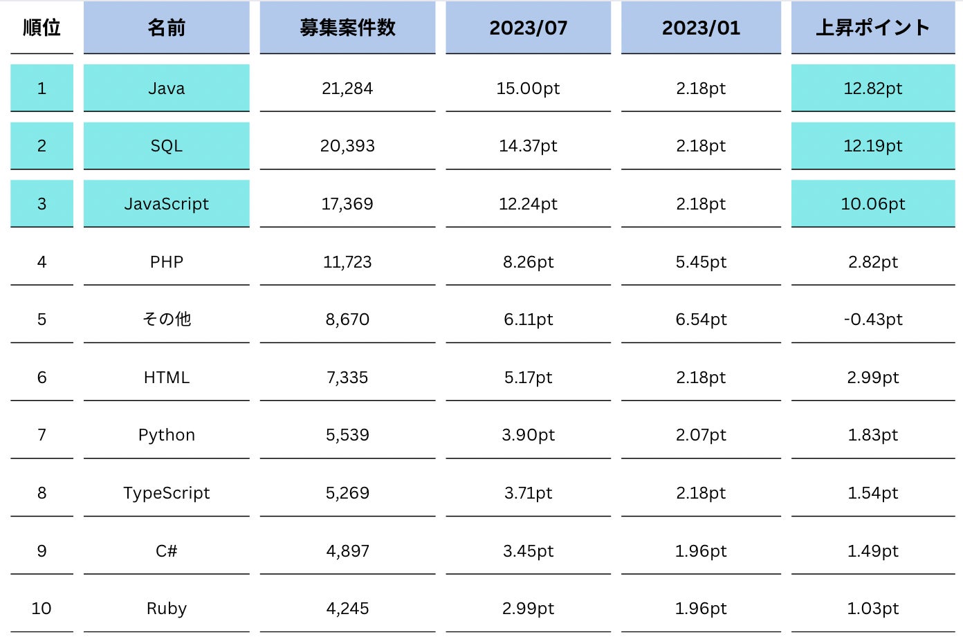 【2023年7月】フリーランスエンジニアの言語別案件数の推移|Javaは半年間で12.82ポイント増加