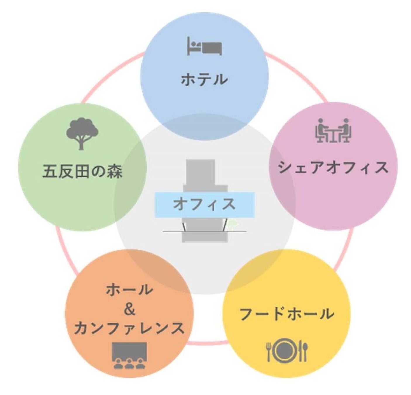本シェアオフィスは500坪超の空間に、コワーキング・個人利用できる専用デスクやブース・3~30坪の個室を有し、フリーランスやスタートアップなどのニーズに応えたスペースを提供するほか、プロジェクト単位で利用できるサービスなどにより多様な働き方に対応します。加えて、館内およびエリア関係者との多様な交流プログラムや公開空地(五反田の森)を利用した地域で参加できるイベントなどを盛り込むことで、コミュニケーションの活性化を促し、コラボレーションやイノベーションの機会を誘発します。