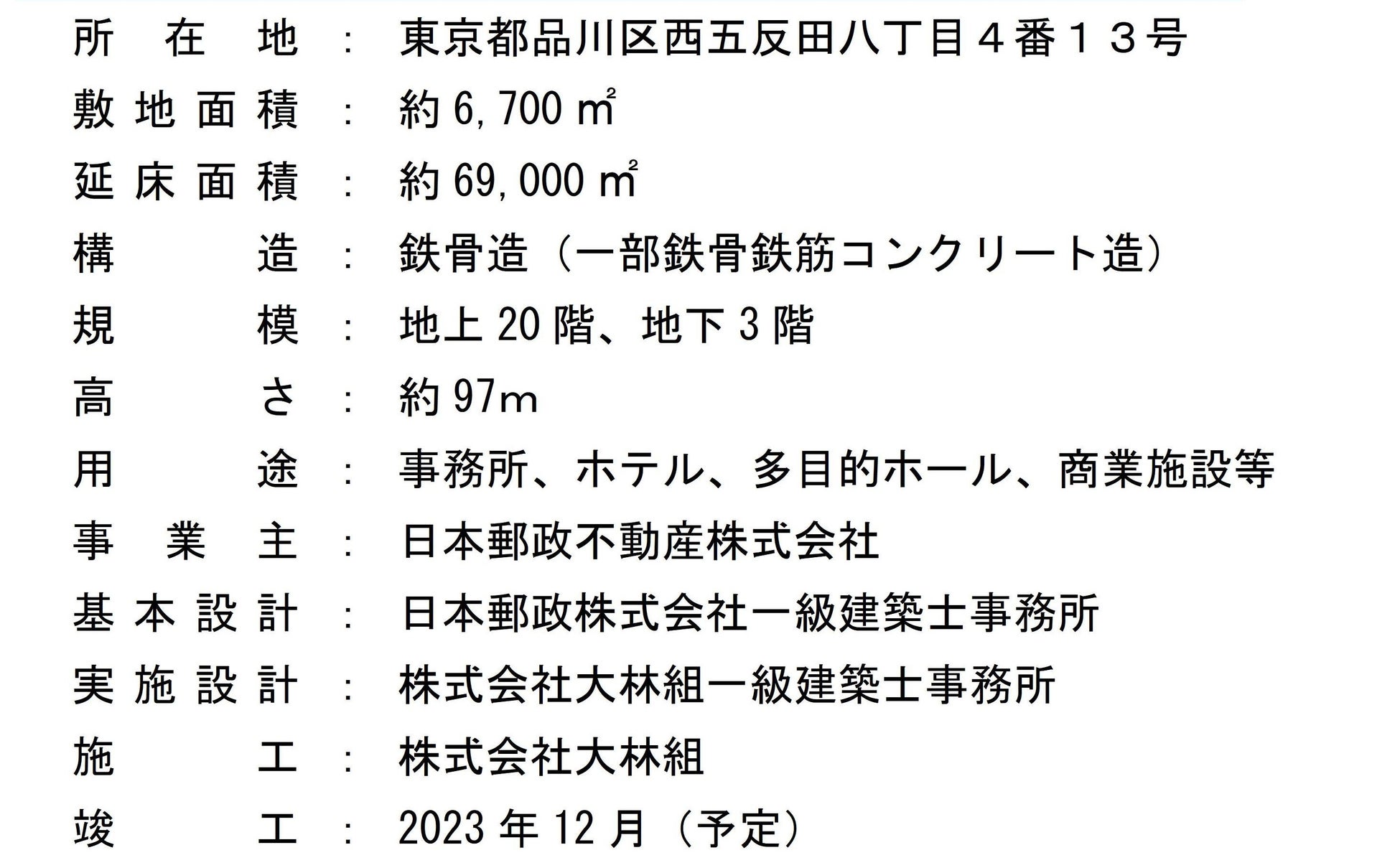 日本郵政不動産株式会社(東京都千代田区、代表取締役社長 山代 裕彦)は、「旧ゆうぽうと」跡地で開発を進めている大規模複合施設「五反田計画(仮称)」(2023年12月竣工予定)(以下「本プロジェクト」)について、地上の鉄骨工事完了に伴う上棟をしましたことをお知らせします。