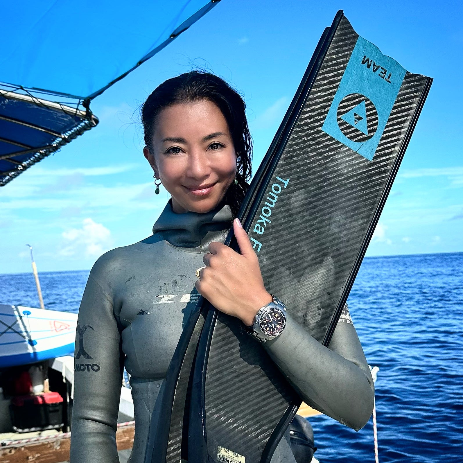 「シェルスターはデザインがかっこよく、軽量なのでずっとつけていても疲れないのが好きです。そして水圧に耐えられる耐久性があるので、安心して一緒に潜る事ができます!」 世界で⼥性史上 5 ⼈⽬となる-100m の潜⽔(CWT)を成功させた有名な女子フリーダイバー福⽥朋夏さんはデルマ・ジャパン公式ブランドアンバサダーとしてシェルスター チタニウムを着用しています。