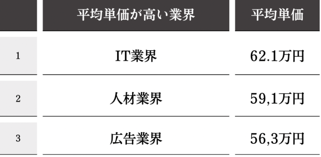 ■営業フリーランスで平均単価が高い業界|第1位はIT業界の62.1万円