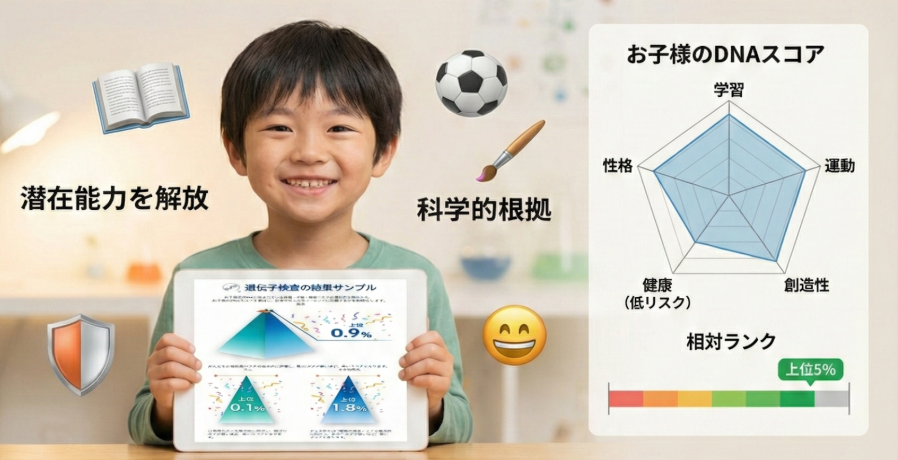 お子様が生まれ持った「本来の力」を数値化し、最適な教育を行うために、最新の遺伝子解析技術を活用する家庭が増えつつあります。「seeDNAの遺伝子検査を受けた4,100人の中で、あなたのお子様のDNAスコアが上位何パーセントに位置するのか」を明確なランクとして提示します。