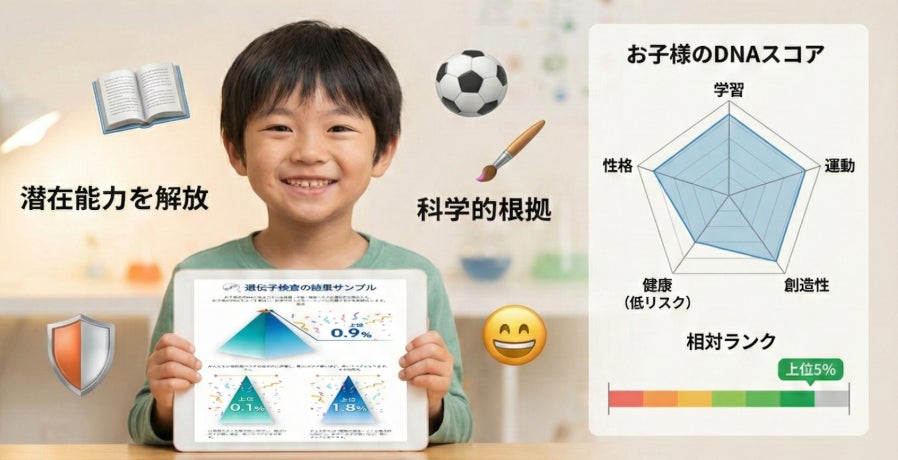 2026年2月、株式会社seeDNA(本社:東京都)は、子供の持つ遺伝的な特性を解析し、そのスコアが全体の中で上位何パーセントに位置するのかが分かる遺伝子検査「子どもDNAスコア」の提供を開始いたしました。