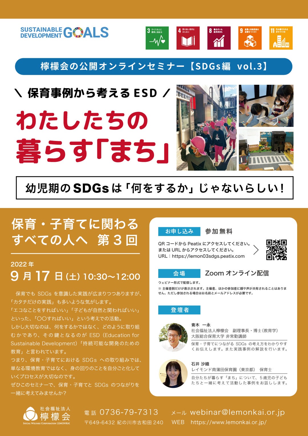 そこで社会福祉法人 檸檬会では、定期的にSDGsに関する無料セミナーを開催し、法人が運営する保育施設での実践事例を通して、子どもと関わるすべての大人が「SDGsと保育・子育てのつながり」について考える場を提供しています。