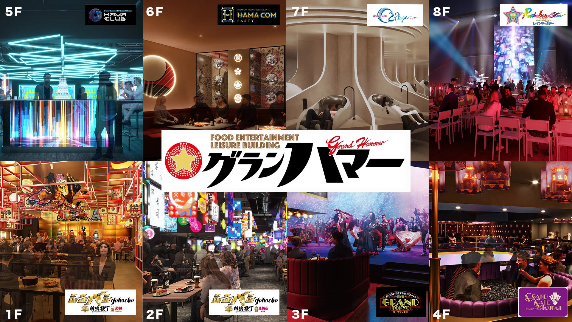 その新橋SL広場前に2024年11月末に開業する『グランハマー』は、恵比寿横丁・渋谷横丁・新宿カブキhallなど、数々の「おとなのたまり場」を展開してきた浜倉的商店製作所が「飲食を超えた異空間体験」をコンセプトに、史上最大規模のビル1棟全9フロア(地下1階~8階/屋上)を「“縦”横丁」とした次世代テーマパーク型フードエンターテインメントレジャービルになります。