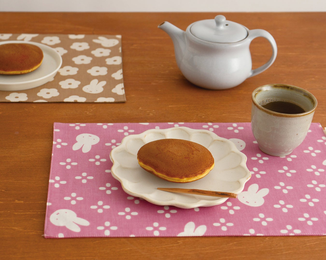 新登場の「おやつしき」は、「おいしい風呂敷」の生地を用いた、裏地付きのこぶりなサイズのティーマット。秋はホットドリンクが美味しくなる季節。お茶とお菓子をのせてティーマットとして、その他キッチンでの敷物やお部屋のインテリアにも使える万能なアイテムです。