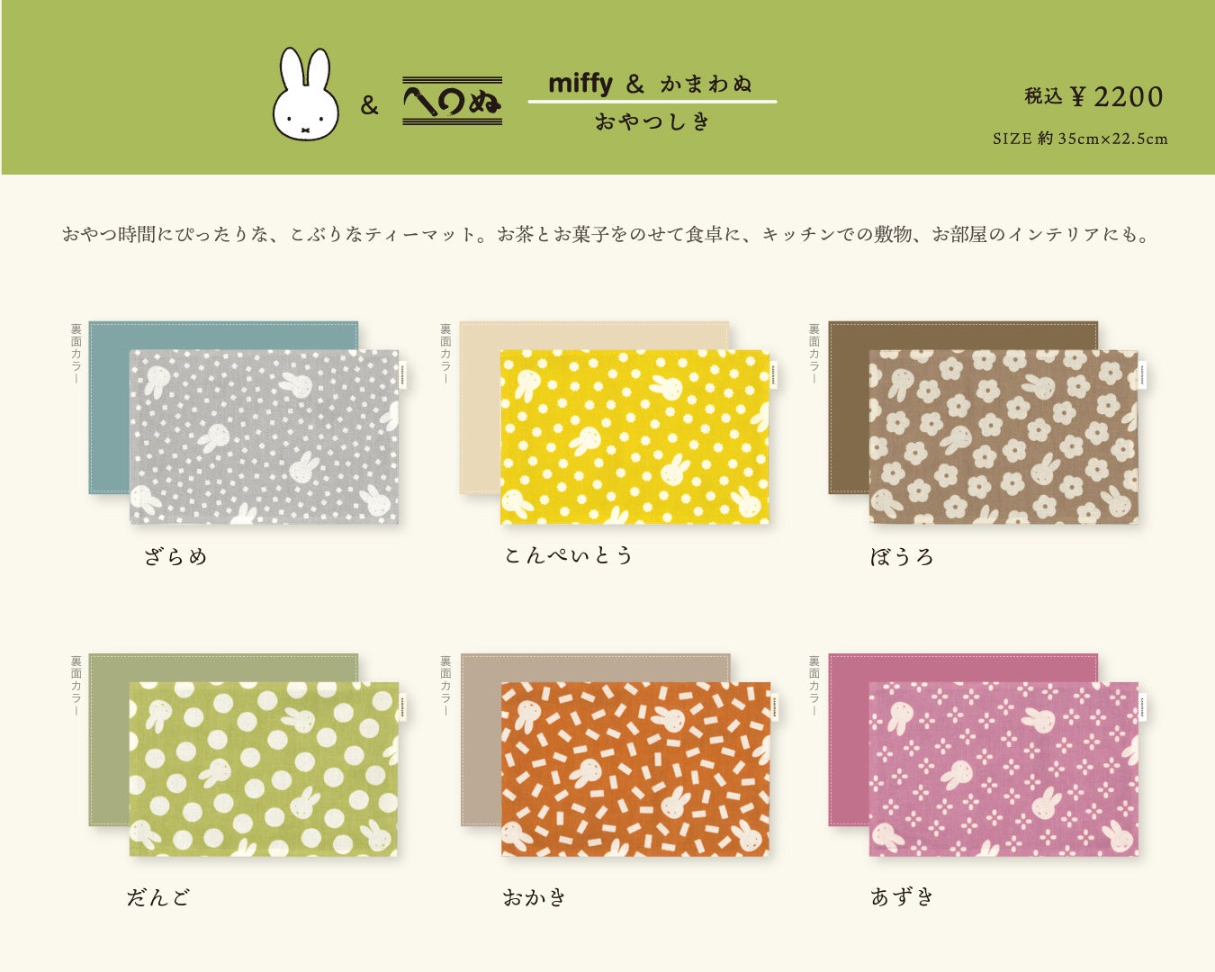 「ぼうろ」や「こんぺいとう」そして「だんご」など、どこかなつかしい「おやつ」をテーマにしたモチーフをデザイン。世代を超えて愛されるミッフィーと、昔ながらの「おやつ」は相性ぴったり。ぬくもりを感じる、おいしそうな色合いに仕上げました。50cmサイズの小風呂敷はお弁当を包むのにはもちろん、ちょっとしたお菓子のプレゼントを包んでエコフレンドリーラッピングにも!