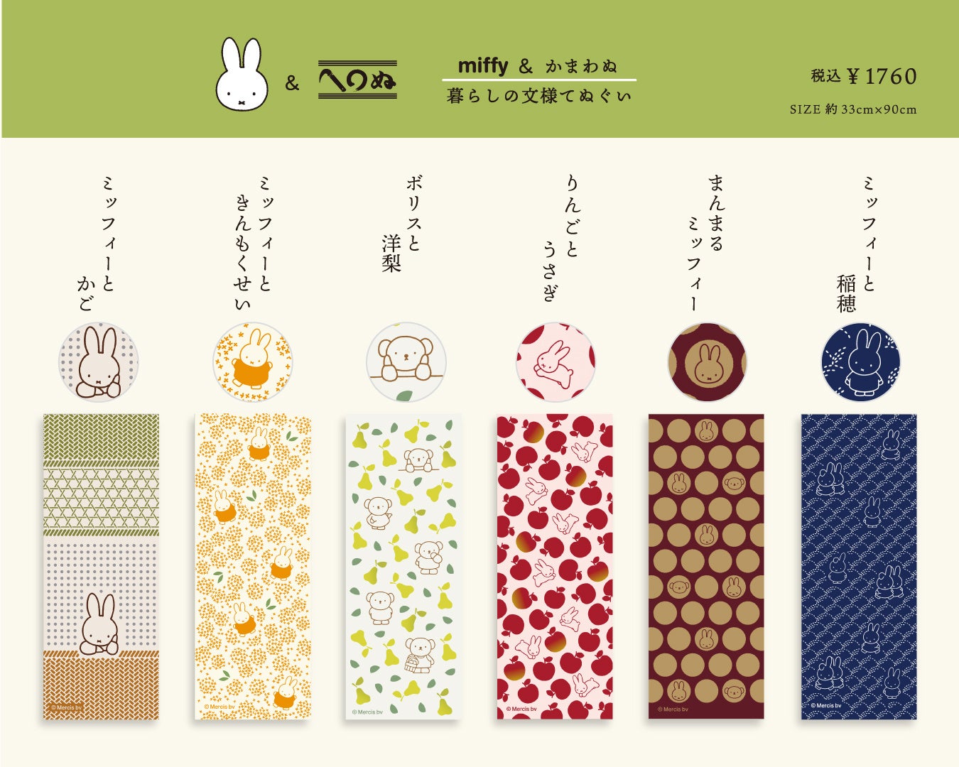 秋の訪れを感じる「キンモクセイ」や「洋梨」といった食べものモチーフを中心に、秋らしい深みのある色で仕上げた全6種類のラインナップ。ミッフィーの他、ボリスやうさぎも登場します。日本独自の染色技法「注染(ちゅうせん)」で染めた手ぬぐいは汎用性抜群!裏表がないのでカフェカーテンとして使ったり、お弁当を包んだりするのにおすすめ。